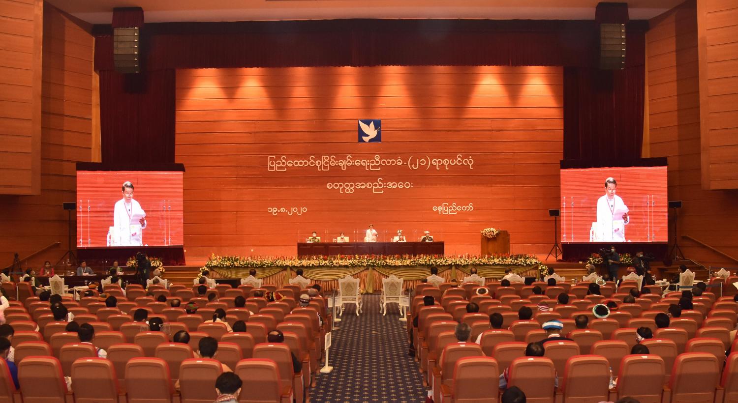 ပြည်ထောင်စု ငြိမ်းချမ်းရေးညီလာခံ-(၂၁)ရာစုပင်လုံ စတုတ္ထအစည်းအဝေး ညီလာခံပထမနေ့ကို ယနေ့မွန်းလွဲပိုင်းတွင် နေပြည်တော်ရှိ မြန်မာအပြည်ပြည် ဆိုင်ရာ ကွန်ဗင်းရှင်းဗဟိုဌာန(၂)၌ ကျင်းပသည်။