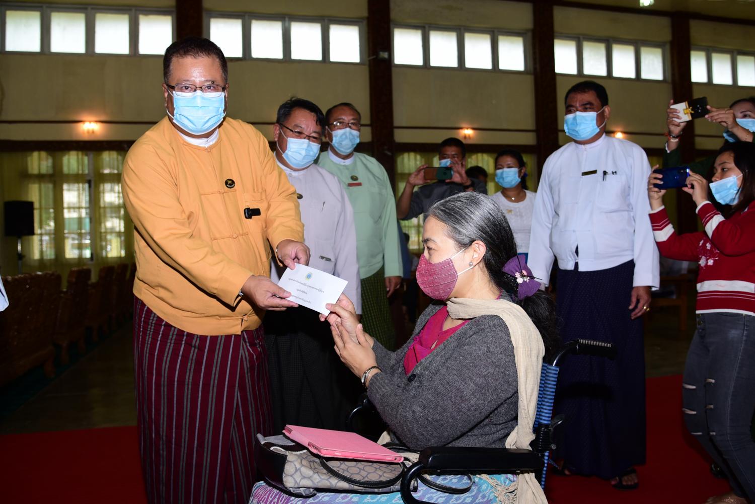 ဆက်လက်၍ ရှမ်းပြည်နယ်ဝန်ကြီးချုပ်၊ ရှမ်းပြည်နယ်မသန်စွမ်းသူများ အခွင့်အရေးများဆိုင်ရာကော်မတီ ဥက္ကဋ္ဌ ဒေါက်တာလင်းထွဋ် ထံသို့ ရှမ်းပြည်နယ်လူမှုဝန်ထမ်းရုံး၊ ညွှန်ကြားရေးမှူး ဦးထွန်းဦး မှ ထပ်တိုး ထောက်ပံ့ ငွေကျပ် (၁၁၆၂၁.၂၅)သိန်း ပေးအပ်ခဲ့ပြီးရှမ်းပြည်နယ်အတွင်းရှိ ထပ်တိုးထောက်ပံ့ပေးမည့် မသန် စွမ်း သူ စုစုပေါင်း(၁၁၃၂၅)ဦး အတွက် တစ်ဦး လျှင် ငွေကျပ်(၃၀၀၀၀)နှုန်းဖြင့် ထောက်ပံ့ကြေးငွေ ကျပ်(၃၃၉၇.၅)သိန်း၊ ရှမ်းပြည်နယ်အတွင်းရှိ စေတနာ့ဝန်ထမ်းအဖွဲ့ အစည်း(၄၆)ခုအတွက် ငွေကျပ် (၅၇၃.၇၅)သိန်း၊ အသက်(၈၅)နှစ်အထက် ဘိုး/ဘွားများ လူမှုရေး ပင်စင်(၁၀၅၀၉)ဦးအတွက် တစ်ဦးလျှင် (၃၀၀၀၀)နှုန်းဖြင့် ငွေကျပ်(၃၁၅၂.၇)သိန်း၊ အသက်(၈၀-၈၅)နှစ် ဘိုး/ဘွားများ လူမှုရေးပင်စင် (၁၄၄၇၆)ဦး အတွက် တစ်ဦးလျှင် ငွေကျပ်(၃၀၀၀၀)နှုန်းဖြင့် ငွေကျပ်(၄၃၄၂.၈)သိန်းတို့ကို ရှမ်းပြည်နယ်အစိုးရအဖွဲ့၊ ပြည်နယ်ဝန်ကြီးချုပ်က ပေးအပ်ရာ ဗမာတိုင်းရင်းသားလူမျိုးရေးရာဝန်ကြီး ဒေါက်တာ အောင်သန်းမောင်က ရယူ၍ ပြည်နယ်ဝန်ကြီး ချုပ်နှင့်ဇနီး၊ တာဝန်ရှိသူတို့က တောင်ကြီးမြို့ပေါ်ရပ်ကွက် (၂၂)ရပ်ကွက်မှ တက်ရောက်လာသော မသန်စွမ်းသူများအား လက်ဝယ်အရောက် ထောက်ပံ့ပေးအပ်ခဲ့ကာ မသန်စွမ်းသူ တစ်ဦး မှ ကျေးဇူး တင်စကား ပြန်လည်ပြောကြားကြောင်း သိရှိရသည်။
