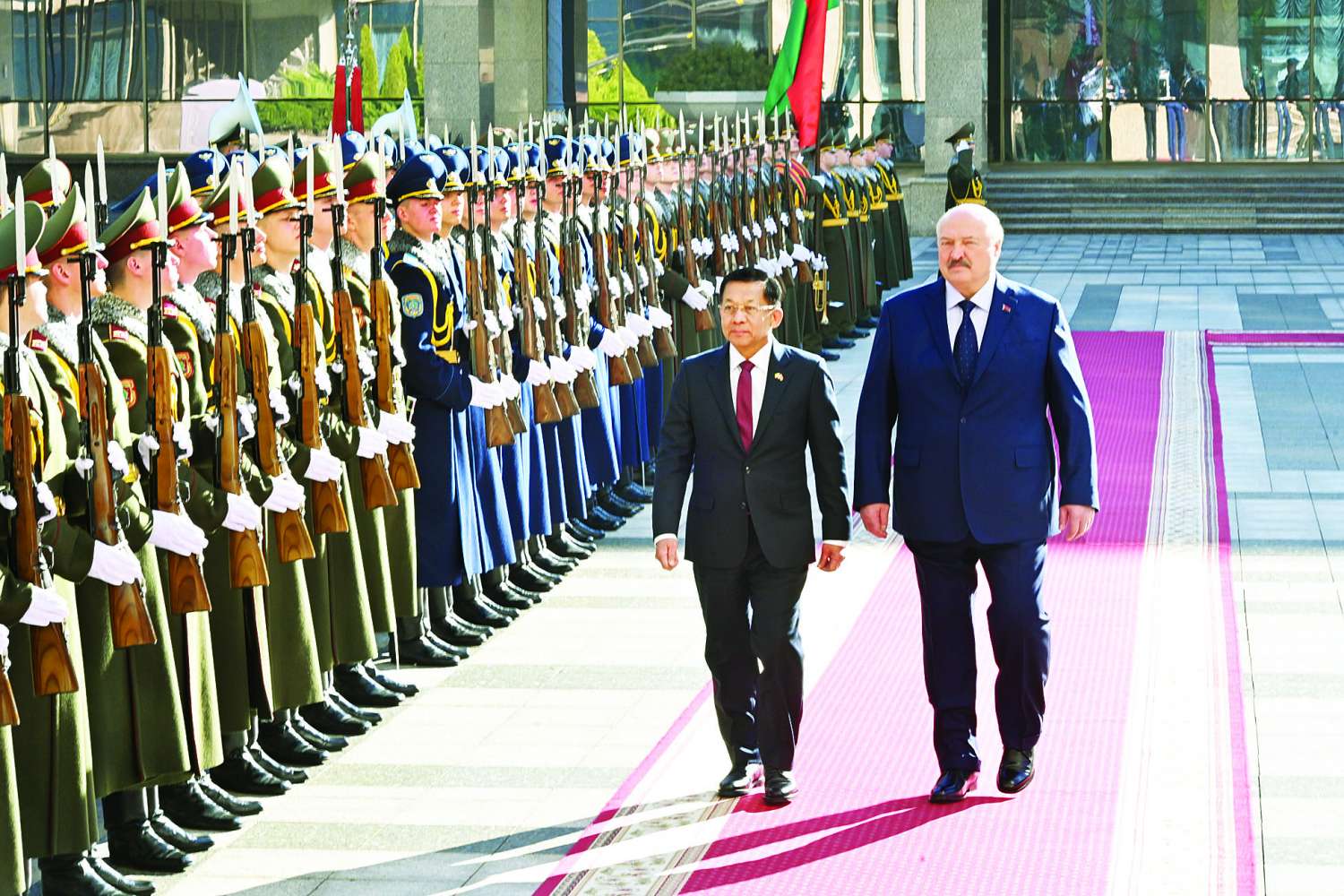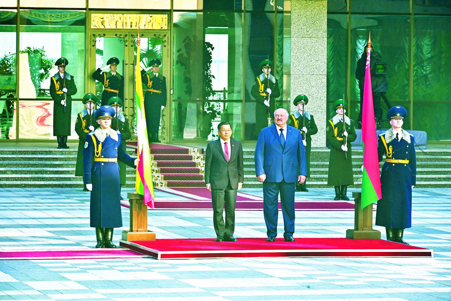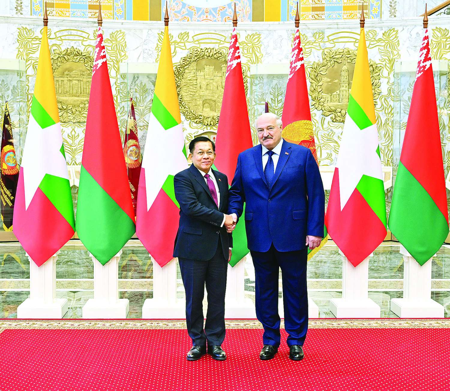 ဘယ်လာရုစ်သမ္မတနိုင်ငံသမ္မတ H.E. Mr. Alexander Gregoryevich Lukashenko ၏ ဖိတ်ကြားချက်အရ ဘယ်လာရုစ်နိုင်ငံသို့ နိုင်ငံတော်အဆင့် (Official State Visit) ချစ်ကြည်ရေးခရီးရောက်ရှိနေသည့် နိုင်ငံတော်စီမံအုပ်ချုပ်ရေးကောင်စီဥက္ကဋ္ဌ နိုင်ငံတော်ဝန်ကြီးချုပ် ဗိုလ်ချုပ်မှူးကြီး မင်းအောင်လှိုင်အား ယနေ့ဒေသစံတော်ချိန် နံနက်ပိုင်းတွင် ဘယ်လာရုစ်နိုင်ငံသမ္မတက သမ္မတနန်းတော်၌ ဂုဏ်ပြုတပ်ဖွဲ့ဖြင့် ကြိုဆိုသည်။