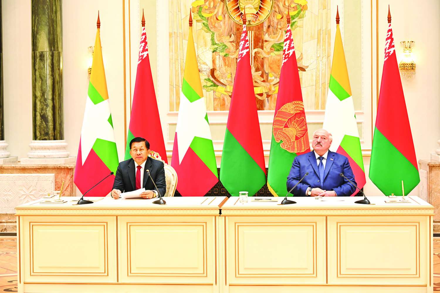 ဒီအခမ်းအနားကို ကြွရောက်လာကြတဲ့ ဘယ်လာရုစ်သမ္မတနိုင်ငံ သမ္မတကြီး H.E. Mr. Alexander Gregoryevich Lukashenko နဲ့ နှစ်ဖက်ကိုယ်စားလှယ်အဖွဲ့ဝင်များ၊ မီဒီယာအဖွဲ့ဝင်များအားလုံးကို မင်္ဂလာပါလို့ နှုတ်ခွန်းဆက်သလိုက်ပါတယ်။ သမ္မတကြီးနဲ့ အစိုးရအဖွဲ့ဝင်များကိုလည်း ကျွန်တော့်ရဲ့ ဒုတိယခရီးစဉ်မှာ ရင်းရင်းနှီးနှီးတွေ့ဆုံဆွေးနွေးခွင့်ရခဲ့ပါတယ်။ ဒီအတွက်လည်း အောင်မြင်တဲ့ခရီးစဉ် တစ်ခုဖြစ်ကြောင်း ပြောလိုပါတယ်။ ဒီလိုဘယ်လာရုစ်-မြန်မာ ချစ်ကြည်ရေးပိုမိုတိုးတက်ခိုင်မာစေဖို့၊ ပူးပေါင်းဆောင်ရွက်မှုအားကောင်းစေဖို့၊ အထူးအားပေးဆောင်ရွက်ခဲ့တဲ့ အဆွေတော်သမ္မတကြီးနှင့် တာဝန်ရှိသူများ၊ ဘယ်လာရုစ်ပြည်သူများ၊ ပြည်သားများအားလုံး ယခုထက်ပိုမိုအင်အားတောင့်တင်း ခေတ်မီဖွံ့ဖြိုးတိုးတက်ကြပါစေကြောင်း ဆုမွန်ကောင်းတောင်းပါတယ်။ ဒီနေ့နှစ်ဦးနှစ်ဖက်တွေ့ဆုံဆွေးနွေးမှုမှာ ပွင့်ပွင့်လင်းလင်း ဆွေးနွေးခဲ့တဲ့အတိုင်းပဲ နှစ်နိုင်ငံစီးပွားရေး၊ စိုက်ပျိုးရေး၊ စက်မှု၊ ပညာရေး၊ သိပ္ပံနဲ့နည်းပညာ၊ ယဉ်ကျေးမှု၊ ကာကွယ်ရေး စတဲ့ကဏ္ဍပေါင်းစုံ ဆက်ဆံရေးကိုလည်း ဆက်လက်မြှင့်တင်ဆောင်ရွက်သွားပါမယ်။ အစိုးရအချင်းချင်းဆက်ဆံရေးသာမက ပြည်သူချင်းဆက်ဆံရေးကိုလည်း တိုးချဲ့ဆောင်ရွက်သွားပါမယ်။ ဒီနှစ်နိုင်ငံနှစ်ဖက်ပူးပေါင်းဆောင်ရွက်မှုတွေကို ဆောင်ရွက်နိုင်ဖို့အတွက် အစိုးရတာဝန်ရှိသူများသာမက တက်ရောက်နေကြတဲ့ မီဒီယာများရဲ့ကဏ္ဍကလည်း အရေးကြီးပါတယ်။ ဒါ့ကြောင့် ဒါကိုလည်း ပူးပေါင်းဆောင်ရွက်ပေးဖို့ မေတ္တာရပ်ခံလိုပါတယ်။ ကျွန်တော်တို့နိုင်ငံဟာ အရှေ့တောင်အာရှထဲမှာ ကုန်းတွင်းနိုင်ငံထဲမှာ အကြီးဆုံးနိုင်ငံတစ်ခုဖြစ်ပါတယ်။ ကမ္ဘာ့လူဦးရေအများဆုံး နိုင်ငံကြီးနှစ်နိုင်ငံဖြစ်တဲ့ တရုတ်နိုင်ငံနဲ့ အိန္ဒိယနိုင်ငံကြားမှာ ဆက်စပ်ပြီးတည်ရှိနေတဲ့ နိုင်ငံဖြစ်သလို အရှေ့တောင်အာရှနဲ့တောင်အာရှအကြားမှာလည်း ပေါင်းကူးတံတားသဖွယ်ရှိနေတဲ့ နိုင်ငံလည်း ဖြစ်ပါတယ်။ စိုက်ပျိုးရေး၊ မွေးမြူရေးနဲ့ လမ်းပန်းဆက်သွယ်ရေးအတွက်ကောင်းမွန်တဲ့ ရေ၊ မြေ၊ ရာသီဥတုကို ပိုင်ဆိုင်ထားတဲ့နိုင်ငံလည်း ဖြစ်ပါတယ်။ ကမ္ဘာမှာဆန်တင်ပို့မှု အဓိကတင်ပို့တဲ့ ထိပ်တန်းနိုင်ငံအထဲမှာပါသလို ကမ္ဘာမှာ ပဲတင်ပို့မှုမှာ ဒုတိယအမြင့် ဆုံးနိုင်ငံတစ်ခုဖြစ်ပါတယ်။ စိုက်ပျိုးရေးနဲ့ မွေးမြူရေးလုပ်ငန်းလုပ်ဖို့လည်း မြေပမာဏများစွာ ကျယ်ဝန်းတဲ့ နိုင်ငံဖြစ်တဲ့အတွက်ကြောင့် ကမ္ဘာ့စားနပ်ရိက္ခာဖူလုံရေးနဲ့ လုံခြုံရေးအတွက် ပံ့ပိုးနိုင်တဲ့နိုင်ငံဖြစ်အောင် ကြိုးစားဆောင်ရွက်နေပါတယ်။ ဒါကြောင့် ဘယ်လာရုစ်နိုင်ငံရဲ့ ခေတ်မီတဲ့ စိုက်ပျိုးရေး၊ မွေးမြူရေး၊ နည်းစနစ်တွေ၊ ယန္တ