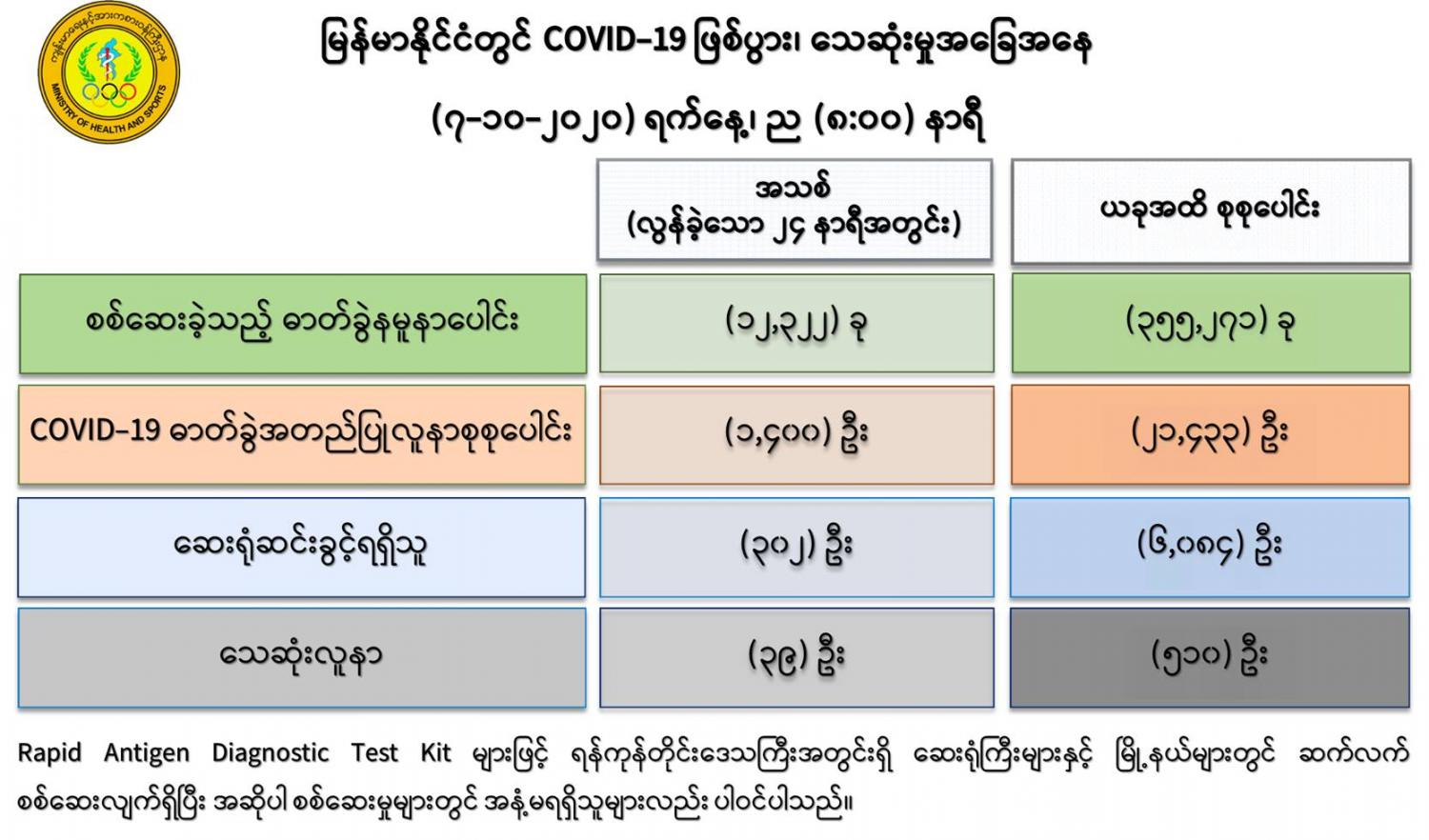 (၆-၁၀-၂၀၂၀) ရက်နေ့၊ ည (၈:၀၀)နာရီမှ (၇-၁၀-၂၀၂၀) ရက်နေ့၊ ည (၈:၀၀)နာရီအတွင်း ဓာတ်ခွဲနမူနာ စုစုပေါင်း (၁၂,၃၂၂) ခုအား စစ်ဆေးပြီးစီးခဲ့ရာ COVID-19 ရောဂါ ဓာတ်ခွဲ အတည်ပြု လူနာသစ် (၁,၄၀၀)ဦး တွေ့ရှိရပါသည်။