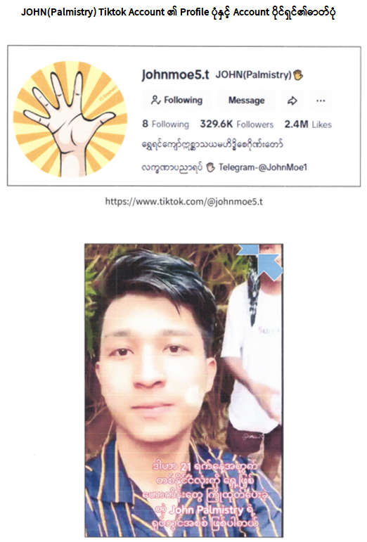 ဂျွန်မိုးသဲအနေဖြင့် ထောင်မှလွတ်မြောက်ပြီးနောက် ဗေဒင်လက္ခဏာပညာအား အသုံးချ၍ ပြည်သူလူထု ထင်ယောင်ထင်မှားဖြစ်စေရန် ရည်ရွယ်ချက်ဖြင့် ၂၀၂၄ ခုနှစ်၊ ဖေဖော်ဝါရီလတွင် Johnmoe5.t အမည်ဖြင့် Tiktok အကောင့်ဖွင့်လှစ်ကာ အကြမ်းဖက်အဖွဲ့အစည်းများနှင့်ပတ်သက်သည့် Post များအားလည်းကောင်း၊ မြေငလျင်နှင့်ပတ်သက်သည့် Post များအားလည်းကောင်း၊ အများပြည်သူ အထိတ်တလန့်ဖြစ်စေရန်ရည်ရွယ်၍ မဟုတ်မမှန်ရေးသားဖော်ပြခဲ့ကြောင်း စိစစ်တွေ့ရှိရသဖြင့် ၎င်းအား ဥပဒေအရ ထိထိရောက်ရောက် အရေးယူသွားမည်ဖြစ်ပြီး နောင်အလားတူ မဟုတ်မမှန်သတင်းအမှားများ ရေးသားဖြန့်ဝေသူများကိုလည်း စိစစ်ဖော်ထုတ်၍ ထိထိရောက်ရောက် အရေးယူဆောင်ရွက်သွားမည်ဖြစ်ကြောင်း၊ မိဘပြည်သူများအနေဖြင့်လည်း သဘာဝဘေးအန္တရာယ်နှင့်ပတ်သက်၍ သတင်း အတုသတင်းအမှားများကို မသမာသူများမှ ဖြန့်ဝေရေးသားဖော်ပြလျက်ရှိသဖြင့် ယုံကြည်မှုမရှိရန်နှင့် သဘာဝဘေးအန္တရာယ်နှင့်ပတ်သက်သည့်သတင်းများအား သက်ဆိုင်ရာ မိုးလေဝသနှင့်ဇလဗေဒညွှန်ကြားမှုဦးစီးဌာနမှ အချိန်နှင့်တစ်ပြေးညီ တိကျစွာထုတ်ပြန်ပေးလျက်ရှိကြောင်း အသိပေးသတင်းထုတ်ပြန်အပ်ပါသည်။