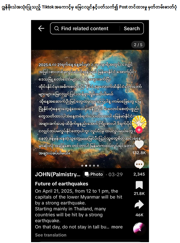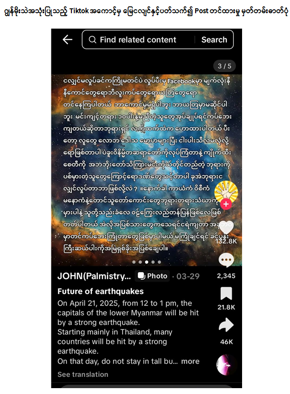 ၂၀၂၅ ခုနှစ်၊ ဧပြီလ ၂၁ ရက်တွင် မြေငလျင်ကြီးမားစွာလှုပ်ခတ်မည်ဟု Tiktok အကောင့်မှတစ်ဆင့် မဟုတ်မမှန်သတင်းအမှားဖြန့်ဝေနေကြောင်းသတင်းအရ ဧပြီလ ၂၂ ရက် ၁၀:၀၀ နာရီတွင် လုံခြုံရေးတပ်ဖွဲ့ဝင်များမှ မုံရွာမြို့၊ မြဝတီရပ်ကွက်၊ တိုးချဲ့ကွက်သစ်ရပ်၊ နယ်မြေ (၂၁)၊ ရွှေညောင်ပင်လမ်းရှိ နေအိမ်သို့သွားရောက်ရှာဖွေခဲ့ရာ တရားခံ John(Palmistry) အကောင့်ပိုင်ရှင် ဂျွန်မိုးသဲအား ဖမ်းဆီးရမိခဲ့ပါသည်။