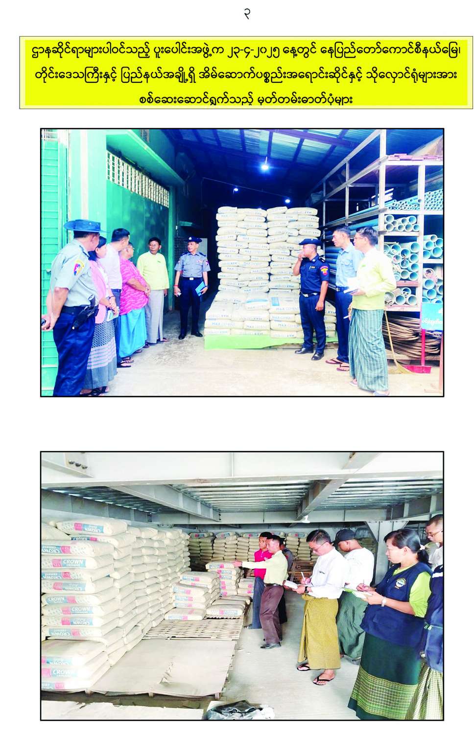 သို့ရာတွင် အချို့သောစီးပွားရေး လုပ်ငန်းရှင်များက လိုက်နာဆောင်ရွက်မှုမရှိဘဲ မတော်လောဘဖြင့် ဆောက်လုပ်ရေးလုပ်ငန်းသုံးပစ္စည်းများကို ဈေးနှုန်းအဆမတန် မြှင့်တင်ရောင်းချမှုများ ဆက်လက်ပြုလုပ်လျက်ရှိကြောင်း သိရှိရသဖြင့် ငလျင်ဒဏ်သင့်ဒေသများအပါအဝင် မြို့ကြီးအချို့၌ ရောင်းဝယ်လျက်ရှိသည့် ဆောက်လုပ်ရေးလုပ်ငန်းသုံးပစ္စည်း အရောင်းဆိုင်/သိုလှောင်ရုံ၊ ဆောက်လုပ်ရေးလုပ်ငန်းသုံး ပစ္စည်းတင်သွင်းဖြန့်ဖြူးရောင်းချ သည့်ကုမ္ပဏီများကို တာဝန်ရှိသူများက ဧပြီ ၂၃ ရက်တွင် ကွင်းဆင်းစစ်ဆေးဆောင်ရွက်ခဲ့သည်။