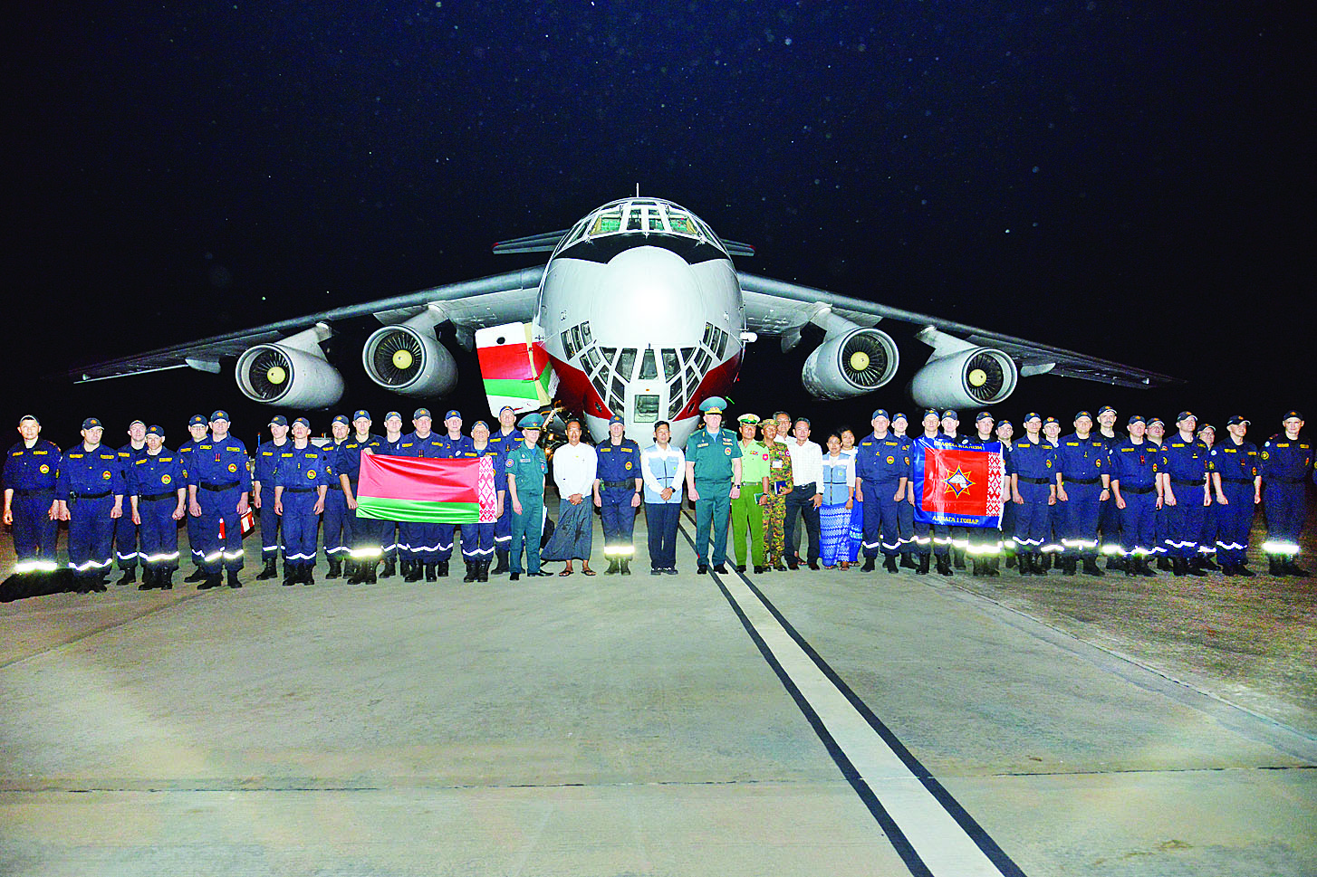 မြန်မာနိုင်ငံအတွင်းရှိ ငလျင်ဘေးဒဏ်သင့်ဒေသများသို့ ကူညီကယ်ဆယ်ရေးလုပ်ငန်းများ ဆောင်ရွက်ပေးရန်အတွက် ရုရှား၊ တရုတ်၊ အိန္ဒိယ၊ ထိုင်း၊ စင်ကာပူ၊ မလေးရှား၊ ဘင်္ဂလား ဒေ့ရှ်၊ ဗီယက်နမ်၊ ယူအေအီး၊ လာအို၊ ဘယ်လာရုစ်၊ အင်ဒိုနီးရှား၊ ဘူတန်၊ ဖိလစ်ပိုင်၊ ဂျပန်၊ နီပေါ၊ ပါကစ္စတန်၊ တူကီယဲ၊ အမေရိကန်၊ သီရိလင်္ကာ၊ ဩစတြေးလျ၊ အဇာဘိုင်ဂျန်၊ ဘရူနိုင်း၊ တောင်ကိုရီးယား၊ ဂျာမနီနှင့် ကမ္ဘောဒီးယားစသည့် နိုင်ငံပေါင်း ၂၆ နိုင်ငံတို့မှ လူသားချင်းစာနာထောက်ထားမှု အကူ အညီပစ္စည်းများ ထောက်ပံ့ပေးခြင်း၊ ရှာဖွေကယ်ဆယ်ရေး လုပ်ငန်းများ ဆောင်ရွက်ရန်အတွက် ရုရှား၊ တရုတ်၊ အိန္ဒိယ၊ ထိုင်း၊ စင်ကာပူ၊ မလေးရှား၊ ဘင်္ဂလားဒေ့ရှ်၊ ဗီယက်နမ်၊ ယူအေအီး၊ ဘယ်လာရုစ်၊ အင်ဒိုနီးရှား၊ ဖိလစ်ပိုင်နှင့် တူကီယဲစသည့် နိုင်ငံ ၁၃ နိုင်ငံတို့မှ ဆေးအကာအကွယ်အဖွဲ့များ ပူးတွဲပါဝင်သည့် ရှာဖွေကယ်ဆယ်ရေးအဖွဲ့ ၁၆ ဖွဲ့ လူဦးရေ ၁၀၇၀ နှင့် ရှာဖွေကယ်ဆယ်ရေး ခွေး ၃၈ ကောင်တို့ဖြင့် ပြည်တွင်းရှိ အဖွဲ့အစည်းများနှင့် ပူးပေါင်းကာ မြေပြင်ကွင်းဆင်း၍ ငလျင် ဒဏ်ကြောင့် ပြိုကျပျက်စီးခဲ့သည့် အဆောက်အဦများအတွင်းသို့ ရောက်ရှိပိတ်မိနေကြသည့် ပြည်သူများအား နိုင်ငံအလိုက် ရှာဖွေကယ်ဆယ်ရေးလုပ်ငန်းများကို သက်စွန့်ကြိုးပမ်းဆောင်ရွက်ခဲ့ကြပြီး ကယ်ဆယ်ရှာဖွေတွေ့ရှိခဲ့သည့် လူနာများအား လိုအပ်သည့် ကျန်းမာရေးစောင့်ရှောက်မှုလုပ်ငန်းများကိုလည်း ကယ်ဆယ်သည့်နေရာတွင်ပင် အမြန်ဆုံးဆောင်ရွက်ပေးနိုင်ခဲ့ပါသည်။