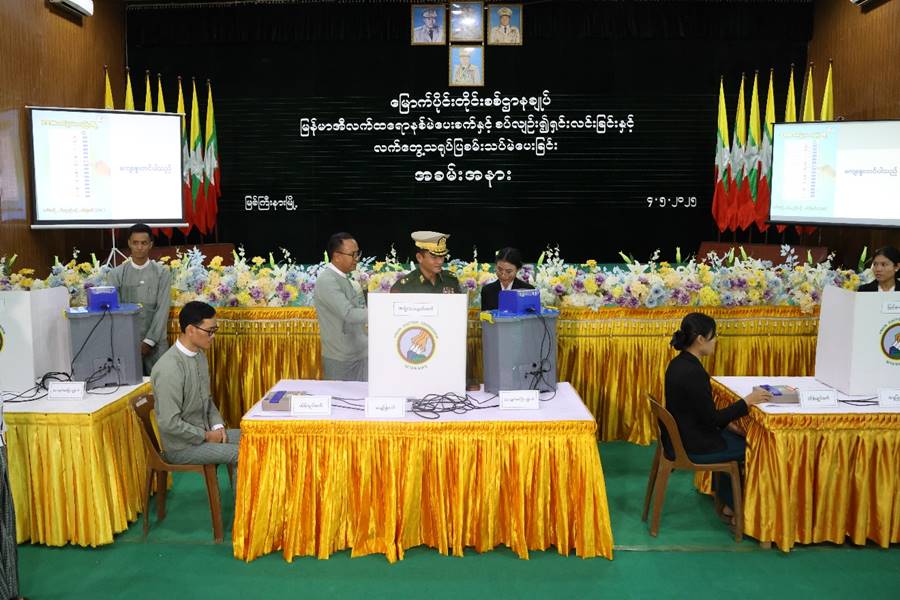 ပြည်ထောင်စုရွေးကောက်ပွဲကော်မရှင်က လာရောက်ဆွေးနွေးသည့် မြန်မာအီလက်ထရောနစ်မဲပေးစက်နှင့်စပ်လျဉ်း၍ ရှင်းလင်းပြသခြင်းနှင့် လက်တွေ့သရုပ်ပြ စမ်းသပ်မဲပေးခြင်းကို ယနေ့မွန်းလွဲပိုင်းတွင် မြောက်ပိုင်းတိုင်းစစ်ဌာနချုပ်ရှိ ဗလမင်းထင်ခန်းမ၌ပြုလုပ်ရာ တိုင်းမှူး ဗိုလ်ချုပ်အောင်ဇော်ထွေးနှင့် ပြည်ထောင်စုရွေးကောက်ပွဲကော်မရှင်မှ တာဝန်ရှိသူများ၊ တိုင်းစစ်ဌာနချုပ်မှ တာဝန်ရှိသူများ၊ တပ်ရင်းတပ်ဖွဲ့မှူးများ၊ အရာရှိ၊ စစ်သည်၊ မိသားစုဝင်များ တက်ရောက်ကြသည်။