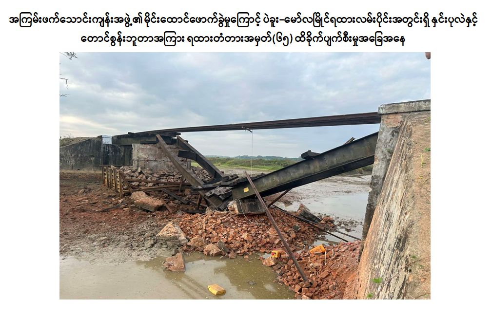 အကြမ်းဖက်သောင်းကျန်းသူအဖွဲ့များအနေဖြင့် ၂၀၂၁ ခုနှစ်၊ ဖေဖော်ဝါရီလမှစ၍ ယခုအချိန်အထိ မြန်မာ့မီးရထားလမ်းကွန်ရက်တစ်ခုလုံးတွင် ရထားလမ်းနှင့် ရထားဘူတာနယ်မြေအတွင်း မိုင်းထောင်ဖောက်ခွဲဖျက်ဆီးခြင်း(၈၁)ကြိမ်၊ ရထားတံတား/ သံလမ်းများအား မိုင်းထောင်ဖောက်ခွဲဖျက်ဆီးခြင်း(၁၇၆)ကြိမ်၊ ဘူတာအဆောက်အဦနှင့် ဝန်ထမ်းနေအိမ်များအား မီးရှို့ဖျက်ဆီးခြင်း(၁၆)ကြိမ် ကျူးလွန်ခဲ့ကြသည်။