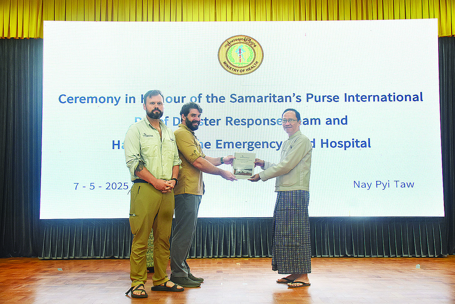ထို့နောက် Samaritan’s Purse International Relief ဆေးအဖွဲ့မှ ရွှေကြာပင်အားကစားကွင်းရှိ အရေးပေါ်ဆေးရုံကို ကျန်းမာရေးဝန်ကြီးဌာနသို့ လွှဲပြောင်းပေးအပ်ပြီး ပြည်ထောင်စုဝန်ကြီးက အမျိုးသားသဘာဝဘေးအန္တရာယ်စီမံခန့်ခွဲမှုကော်မတီဥက္ကဋ္ဌကိုယ်စား ဂုဏ်ပြုမှတ်တမ်းလွှာနှင့် အမှတ်တရလက်ဆောင်များ ပြန်လည်ပေးအပ်သည်။