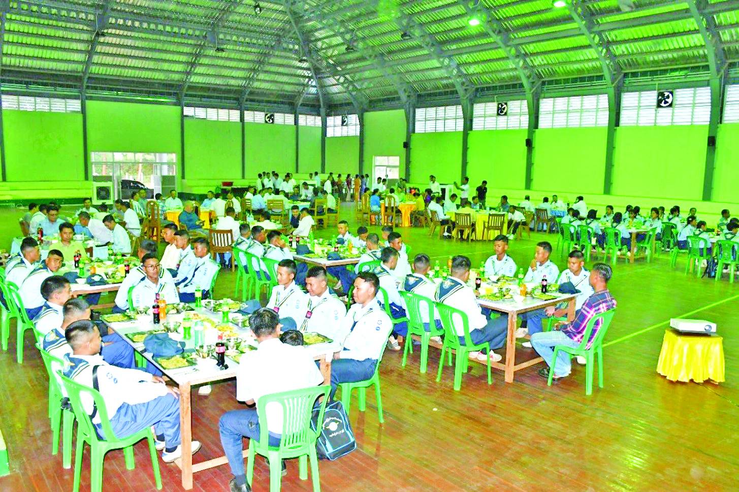 အခြေခံလေကြောင်းလူငယ်သင်တန်း အမှတ်စဉ်(၁/၂၀၂၅) (တောင်ကြီးစခန်း)၌ တက်ရောက်သင်ကြားလျက်ရှိသည့် သင်တန်းသား၊ သင်တန်းသူများအတွက် အထူးနေ့လယ်စာစားပွဲကို ယနေ့မွန်းလွဲပိုင်းတွင် အရှေ့ပိုင်းတိုင်းစစ်ဌာနချုပ် သံလွင်ခန်းမ၌ ပြုလုပ်ရာ တိုင်းမှူး ဗိုလ်ချုပ် ဇော်မင်းလတ်နှင့် အဖွဲ့ဝင်များ၊ ပြည်နယ်ဝန်ကြီးများ၊ သင်တန်းနည်းပြများ၊ သင်တန်းသား၊ သင်တန်းသူများနှင့် ဖိတ်ကြားထားသူများ တက်ရောက်ကြသည်။