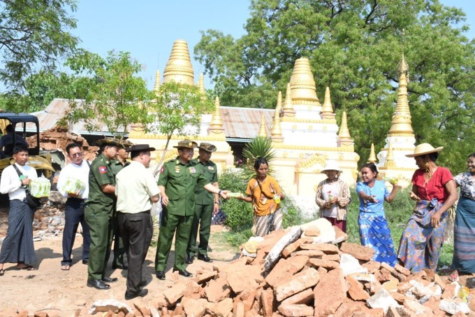 အလားတူ ကာကွယ်ရေးဦးစီးချုပ်ရုံး(ကြည်း)မှ ဒုတိယဗိုလ်ချုပ်ကြီး မျိုးသန့်နိုင်နှင့် တာဝန်ရှိသူများသည် ကျောက်ဆည်မြို့၊ ငှက္ကတောင်ကျေးရွာအုပ်စု၊ ရွာဦးဘုန်းကြီးကျောင်းတိုက်ရှိ ငလျင်ဒဏ်ကြောင့် ပျက်စီးသွားသော ရွာဦးသိမ်စေတီအပျက်အစီးများအား မြို့မိမြို့ဖများစုပေါင်း၍ ရှင်းလင်းဆောင်ရွက်နေမှု အခြေအနေများအား သွားရောက်ကြည့်ရှုစစ်ဆေးခဲ့ပြီး မြို့မိ၊မြို့ဖများအတွက် အချိုရည်နှင့်ရေသန့်ကဒ်များ ပေးအပ်ခဲ့ကာတာဝန်ရှိသူများနှင့် လိုအပ်သည်များ ပေါင်းစပ်ညှိနှိုင်းဆောင်ရွက်ပေးသည်။
