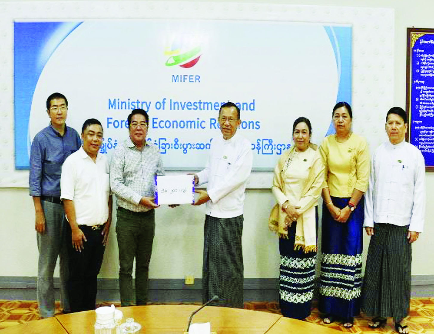 ရန်ကုန်မြို့ရှိ မြန်မာနိုင်ငံဆိုင်ရာ တရုတ်ပြည်သူ့သမ္မတနိုင်ငံသံရုံးနှင့် MYANMAR-CHINA (JIANGSU) CHAMBER OF COMMERCE တို့က ရင်းနှီးမြှုပ်နှံမှုနှင့်နိုင်ငံခြားစီးပွားဆက်သွယ်ရေးဝန်ကြီးဌာန၏ ငလျင်ဘေးသင့်ဝန်ထမ်းများအတွက် လျှပ်စစ်ရေနွေးအိုး၊ လေအေးပေးပန်ကာ၊ ဆိုလာမီးလုံး၊ စောင်၊ ခြင်ထောင်၊ ဖျာ၊ ဆပ်ပြာ၊ ခေါင်းလျှော်ရည်စသည့် လူသုံးကုန်ပစ္စည်းအမျိုးအစားရှစ်မျိုးကို ယနေ့နံနက်ပိုင်းတွင် ရင်းနှီးမြှုပ်နှံမှုနှင့်နိုင်ငံခြားစီးပွားဆက်သွယ်ရေးဝန်ကြီးဌာန ရုံး အမှတ် (၁) သို့ လာရောက်လှူဒါန်းသည်။
