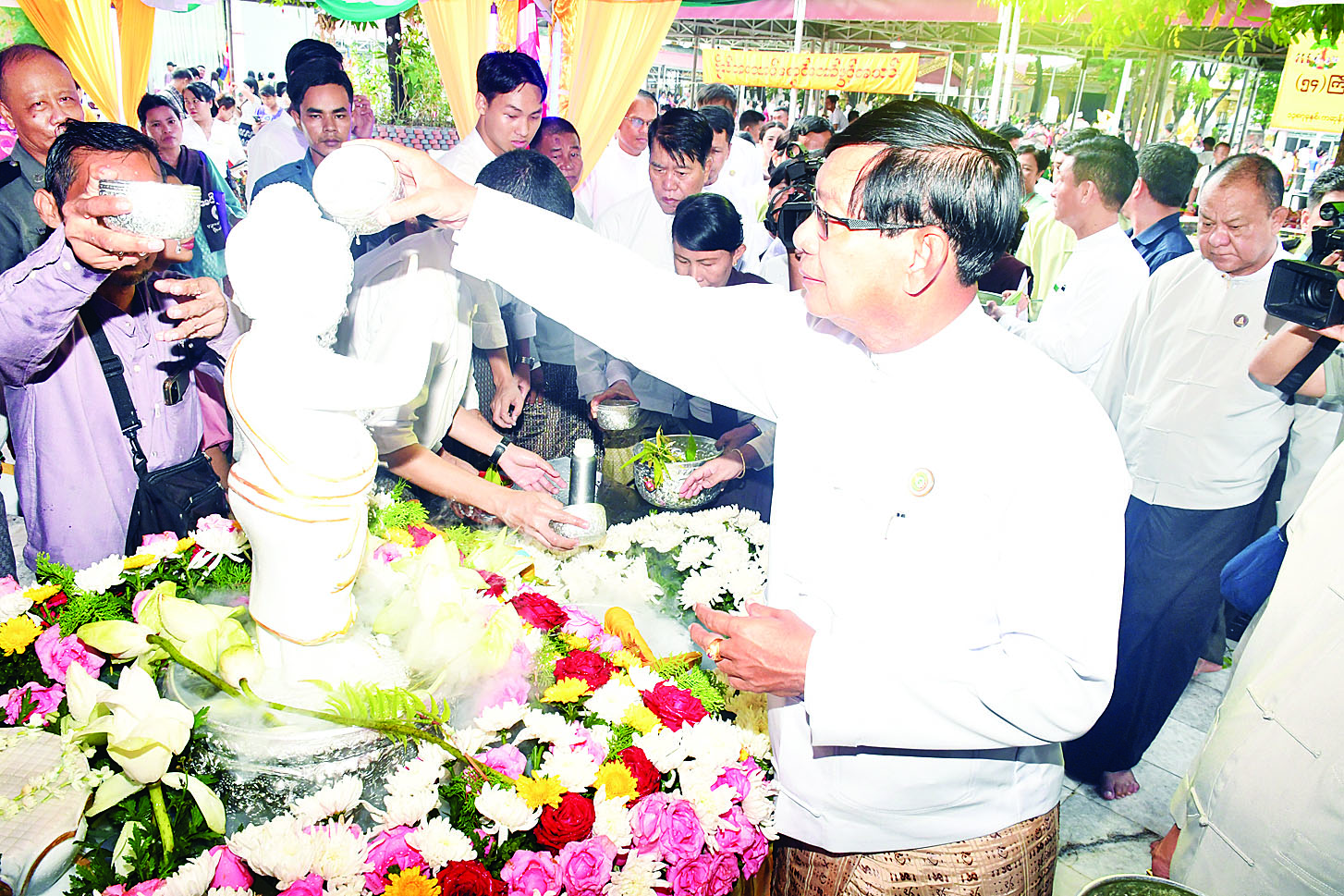 ဆက်လက်၍ တိုင်းဒေသကြီးဝန်ကြီးချုပ်နှင့် ဇနီး၊ တာဝန်ရှိသူများသည် ဆူးလေစေတီတော်နှင့် ဗိုလ်တထောင်ကျိုက်ဒေးအပ် ဆံတော်ဦးစေတီတော်၊ သီရိမင်္ဂလာ ကမ္ဘာအေးစေတီတော် ဂေါပကအဖွဲ့တို့က ကြီးမှူးကျင်းပသည့် ကဆုန်လပြည့်(ဗုဒ္ဓနေ့) ညောင်ရေသွန်းလောင်း ပူဇော်ပွဲများသို့ တက်ရောက်ကြပြီး စေတီတော်ရှိ ဗုဒ္ဓရုပ်ပွားတော်မြတ်များအား ဖူးမြော်ကြည်ညိုကြ၍ ဗောဓိညောင်ပင်များအား ဂေါပကအဖွဲ့ဝင်များ၊ ဘာသာရေးဝတ်အသင်း အဖွဲ့များ၊ ဘုရားဖူးလာပြည်သူများနှင့်အတူ ညောင်ရေသွန်းလောင်း ပူဇော်ကြသည်။