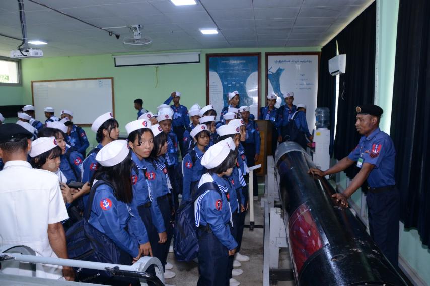 မွန်းလွဲပိုင်းတွင် သင်တန်းသား၊ သင်တန်းသူများသည် တပ်မတော်(ရေ)မှ စစ်ရေယာဉ်(မုတ္တမ)ဖြင့် ရန်ကုန်မြစ်ကြောင်းတစ်လျှောက် လေ့လာရေးသွားရောက်ကြရာ လေ့လာရေးခရီးစဉ်အတွင်း စစ်ရေယာဉ်၏ ရေယာဉ်ဆိုင်ရာအချက်အလက်များ၊ လက်နက်နှင့် လက်နက်စနစ်များ၊ စက်ပိုင်းဆိုင်ရာစနစ်များ၊ ရေကြောင်းသွားလာရေးဆိုင်ရာ အထွေထွေဗဟုသုတများ၊ ဆက်သွယ်ရေးနှင့် အီလက်ထရောနစ်ဆိုင်ရာစနစ်များ၊ ရေယာဉ်ခုတ်မောင်းနေစဉ် ဆောင်ရွက်ရမည့်လုပ်ငန်းတာဝန်များနှင့် အခြားသိသင့်သိထိုက်သည်များအား စိတ်ပါဝင်စားစွာ လေ့လာခဲ့ကြပြီး တာဝန်ရှိသူများက လိုက်လံရှင်းလင်းပြသသည်။