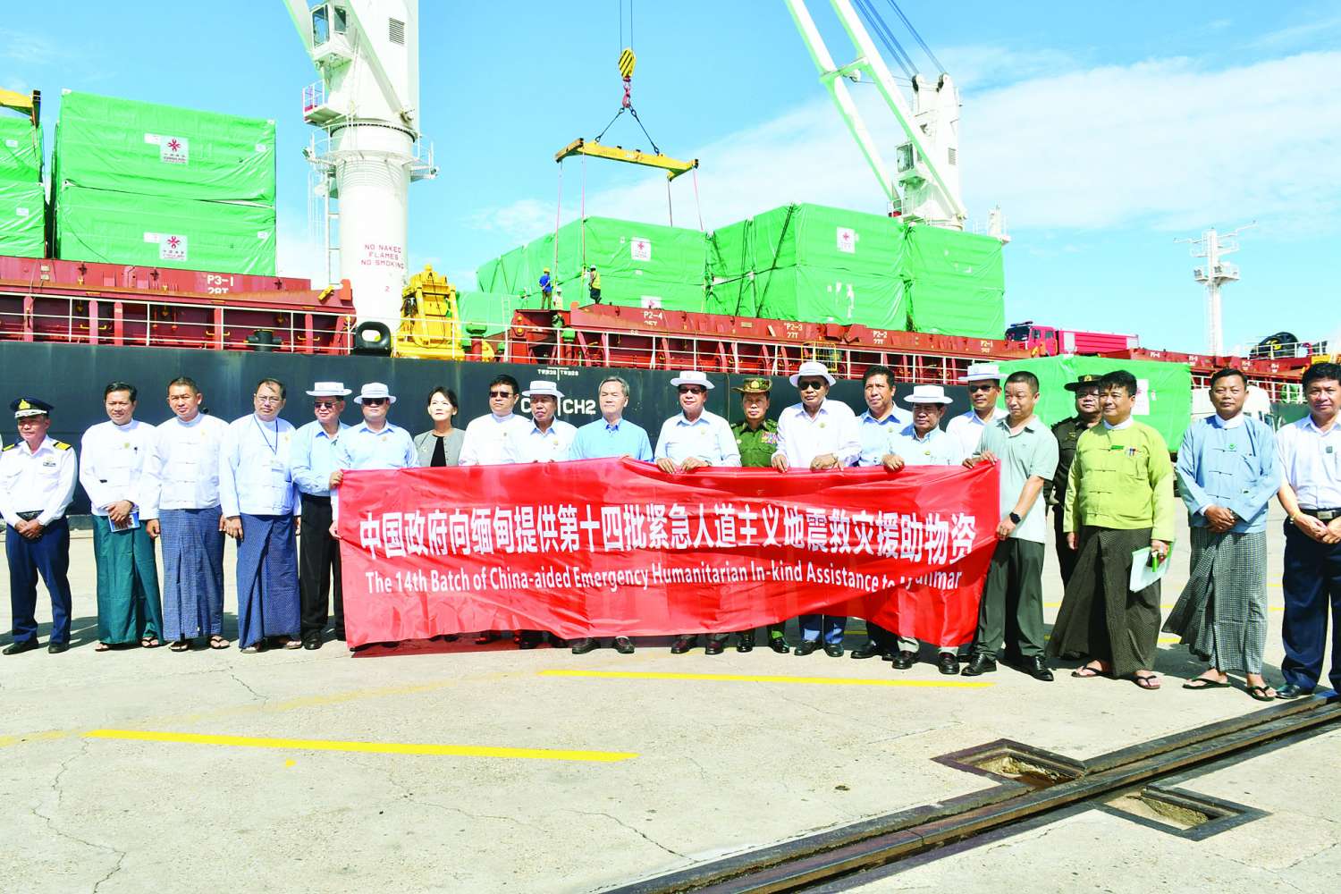 ထိုသို့ရောက်ရှိလာသည့် Operation Room ၉၅ လုံးနှင့် Modular (prefabricated) house ၁၈၀၄ လုံးတို့ကို ယနေ့နံနက်ပိုင်းက လွှဲပြောင်းလက်ခံရာ ရန်ကုန်တိုင်းဒေသကြီးဝန်ကြီးချုပ် ဦးစိုးသိန်း၊ တိုင်းဒေသကြီးဝန်ကြီးများ၊ နိုင်ငံခြားရေးဝန်ကြီးဌာန မဟာဗျူဟာလေ့လာရေးနှင့်လေ့ကျင့်ရေးဦးစီးဌာနမှ တာဝန်ရှိသူများ၊ ကျန်းမာရေးဝန်ကြီးဌာန၊ ပြည်သူ့ကျန်းမာရေးဦးစီးဌာနမှ တာဝန်ရှိသူများ၊ မြန်မာ့မီးရထားမှ တာဝန်ရှိသူများ၊ လူမှုဝန်ထမ်း၊ ကယ်ဆယ်ရေးနှင့် ပြန်လည်နေရာချထားရေးဝန်ကြီးဌာန၊ ဘေးအန္တရာယ်ဆိုင်ရာစီမံခန့်ခွဲမှုဦးစီးဌာနမှ တာဝန်ရှိသူများ၊ သန်လျင်ခရိုင်စီမံအုပ်ချုပ်ရေးအဖွဲ့ဥက္ကဋ္ဌနှင့် အဖွဲ့ဝင်များ၊ ကျောက်တန်းမြို့နယ် စီမံအုပ်ချုပ်ရေးအဖွဲ့ဥက္ကဋ္ဌနှင့် အဖွဲ့ဝင်များ၊ တာဝန်ရှိသူများသည် တရုတ်သံရုံးမှ စီးပွားရေးသံမှူး Mr. Ouyang Daobing ထံမှ သီလဝါဆိပ်ကမ်း၌ (၁၄) ကြိမ်မြောက် လွှဲပြောင်းလက်ခံခဲ့သည်။