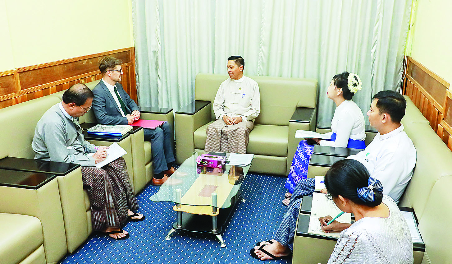 တွေ့ဆုံစဉ် ပြည်ထောင်စုဝန်ကြီးက မန္တလေးငလျင်ကြီးလှုပ်ခတ်မှုကြောင့် ထိခိုက်ဆုံးရှုံးမှုများအား ပြည်လည်ထူထောင်ရေးအတွက် နိုင်ငံတော်အစိုးရက ဆောင်ရွက်နေမှုအခြေအနေများ၊ ဆောက်လုပ်ရေးလုပ်ငန်းသုံးပစ္စည်းများ လိုအပ်နေမှုနှင့် နိုင်ငံတကာအဖွဲ့အစည်းများ၏ ပူးပေါင်းဆောင်ရွက်မှုများကို ကြိုဆိုကြောင်းဆွေးနွေးပြီး ICRC ဘက်မှ ငလျင်ဘေးသင့်ဒေသများအတွက် ရေရရှိရေး၊ ကျန်းမာရေးနှင့် ဆေးဘက်ဆိုင်ရာ အထောက်အပံ့ပေးနေမှုလုပ်ငန်းများနှင့် ICRC ၏ ပုံမှန်ဆောင်ရွက်နေသောလုပ်ငန်းများကို ရှင်းလင်းတင်ပြသည်။ ထို့နောက် ဝန်ကြီးဌာနနှင့် ICRC တို့အကြား ပူးပေါင်းဆောင်ရွက်လျက်ရှိသော လုပ်ငန်းများနှင့် ဆက်လက်ပူးပေါင်းဆောင်ရွက်မည့် ကိစ္စများကို အမြင်ချင်းဖလှယ်ဆွေးနွေးကြသည်။