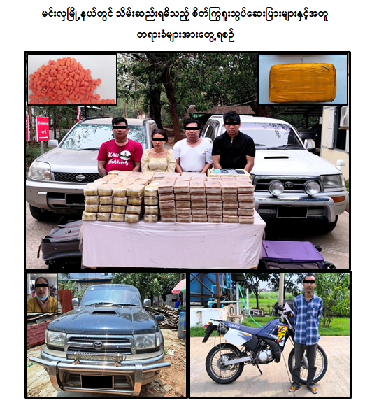 လုံခြုံရေးတပ်ဖွဲ့ဝင်များပါဝင်သော ပူးပေါင်းအဖွဲ့သည် မေလ ၉ ရက်နေ့ မွန်းလွဲ ၂ နာရီခွဲအချိန် မင်းလှမြို့နယ်၊ ပုသိမ်-မုံရွာသွားကားလမ်း၊ ရှမ်းတဲကျေးရွာအနီးတွင် သတင်းအရစောင့်ဆိုင်းနေစဉ် မင်းလှဘက်မှ မင်းတုန်းဘက်သို့ ပြည့်ဖြိုးကျော်မောင်းနှင်ပြီး မဇင်ဇင်ဝေ(ခ)ဇင်ဇင်မာ လိုက်ပါလာသည့် X-TRAIL မော်တော်ယာဉ်နှင့် ရန်နိုင်ထွဋ် မောင်းနှင်ပြီး တင်လတ်လိုက်ပါလာသည့် SURF မော်တော်ယာဉ်တို့ကိုရှာဖွေခဲ့ရာ အဆိုပါယာဉ် ၂ စီးပေါ်မှ စိတ်ကြွရူးသွပ်ဆေးပြား ၂၁ ဒသမ ၈ သိန်း ဖမ်းဆီးရမိခဲ့ပြီး ၎င်းတို့၏ ဖော်ထုတ်ချက်အရ ပျဉ်းမနားမြို့မှ မကွေးတိုင်းဒေသကြီး၊ မင်းတုန်းမြို့နယ်သို့ စိတ်ကြွရူးသွပ်ဆေးပြားများ သယ်ဆောင်ခိုင်းသူ မနန်း(ခ)မျိုးသီရိကျော်နှင့် မျိုးဇော်အောင်တို့ ၂ ဦး၏ မူးယစ်ဆေးဝါးသယ်ဆောင်ရာ၌ အသုံးပြုခဲ့သည့် TOYOTA HILUX SURF မော်တော်ယာဉ်တစ်စီးအား ပျဉ်းမနားမြို့၊ ရန်အောင်(၂)ရပ်ကွက်ရှိ ၎င်းတို့၏နေအိမ်တွင် သိမ်းဆည်းရမိခဲ့ကြောင်း၊ မျိုးဇော်အောင်နှင့် မနန်း(ခ)မျိုးသီရိကျော်တို့သည် ပျဉ်းမနားမြို့နယ်၊ မြောက်လွတ်ကုန်းကျေးရွာရှိအောင်နိုင်၏ နွားခြံစတိုအတွင်း ကရင်ပြည်နယ်သို့ပို့ဆောင်မည့် မူးယစ်ဆေးဝါးများ သိုဝှက်ထားကြောင်းသိရှိရသဖြင့် မူးယစ်ဆေးဝါးတားဆီးနှိမ်နင်းရေးရဲတပ်ဖွဲ့မှ တပ်ဖွဲ့ဝင်များပါဝင်သော ပူးပေါင်းအဖွဲ့သည် မေလ ၁၀ ရက်နေ့ ညနေ ၅ နာရီခွဲအချိန် ပျဉ်းမနားမြို့နယ်၊ မြောက်လွတ်ကုန်းကျေးရွာရှိ အောင်နိုင်၏ နွားမွေးမြူရေးခြံသို့ ဝင်ရောက်ရှာဖွေခဲ့ရာ အောင်နိုင်နှင့် ဇော်ဝင်းတို့ ၂ ဦးအား စိတ်ကြွရူးသွပ်ဆေးပြား ၇၆ ဒသမ ၁၇၈ သိန်း၊ အိုက်စ်(မက်သ်အဖက်တမင်း) ၅ ကီလို၊ ကက်တမင်း ၁ ကီလိုနှင့် စိတ်ပြောင်းဆေးဝါးများ ရောစပ်ထားသည့် Happy Water ၂ ဒသမ ၉၁၅ ကီလိုတို့နှင့်အတူ ထပ်မံဖမ်းဆီးရမိခဲ့သဖြင့် စုစုပေါင်းဒေသတန်ဖိုးငွေ ၁၆ ဒသမ ၂ ဘီလီယံတန်ဖိုးရှိ စိတ်ကြွရူးသွပ်ဆေးပြား ၉၇ ဒသမ ၉ သိန်းကျော်၊ အိုက်စ်(မက်သ်အဖက်တမင်း) ၅ ကီလို၊ ကက်တမင်း ၁ ကီလိုနှင့် စိတ်ပြောင်းဆေးဝါးများ ရောစပ်ထားသည့် Happy Water ၂ ဒသမ ၉၁၅ ကီလို ဖမ်းဆီးရမိခဲ့ကြောင်းနှင့် မေလ ၁၁ ရက်နေ့ နံနက် ၉ နာရီခွဲအချိန် စိတ်ကြွရူးသွပ်ဆေးပြားများ တင်ဆောင်ပေးသူထွန်းလင်း(ခ) ရှမ်းကုလားအား ပဲခူးတိုင်းဒေသကြီး၊ ဝေါမြို့နယ်၊ ညောင်ခါးရှည်ကျေးရွာအနီးတွင် မော်တော်ဆိုင်ကယ်တစ်စီးနှင့်အတူ ဖမ်းဆီးရမိခဲ့ကြောင်း၊ စစ်ဆေးဖော်ထုတ်ချက်များအရ မျိုးဇော်အောင်နှင့် မနန်း(ခ) မျိုးသီရိကျော်တို့သည် ရှမ်းပြည်နယ်မှ သယ်ဆောင်လာသော မူးယစ်ဆေးဝါးများကို ပျဉ်းမနားမြို့နယ်မှတစ်ဆင့် မင်းတုန်းမြို့နယ်သို့ သယ်ဆောင်ရောင်းဝယ်ရာတွင် တင်လတ်(ခ) စောတင်လတ်မှ တာဝန်ခံ၍ ပြည့်ဖြို