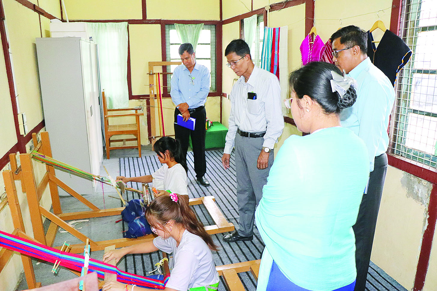 သမဝါယမနှင့်ကျေးလက်ဖွံ့ဖြိုးရေးဝန်ကြီးဌာန ဒုတိယဝန်ကြီး ဦးမြင့်စိုးသည် ယမန်နေ့ ညနေပိုင်းက ရှမ်းပြည်နယ် (တောင်ပိုင်း) တောင်ကြီးမြို့ အသေးစားစက်မှုလက်မှုလုပ်ငန်းဦးစီးဌာန၊ ရက်ကန်းနှင့် အသက်မွေးပညာသင်တန်းကျောင်းသို့ သွားရောက်၍ သင်တန်းကျောင်းအုပ်၊ ဆရာ ဆရာမများ၊ လက်ရက်ကန်းခြောက်လသင်တန်းတက်ရောက်နေသော သင်တန်းသူ သင်တန်းသားများနှင့် တွေ့ဆုံကာ လိုအပ်သည်များ မှာကြားပြီး သင်တန်းသူများ လက်တွေ့ဆောင်ရွက်နေသည့် လက်ရက်ကန်းဖြင့် ပအိုဝ်းခေါင်းပေါင်း၊ ဓနုလုံချည်နှင့် ဒေသခံတိုင်းရင်းသားဝတ်စုံများ ရက်လုပ်နေမှုကိုလည်းကောင်း၊ စက်ရက်ကန်းရက်လုပ်ခြင်း၊ ချားပုတ်ခြင်း၊ ချည်ချခြင်းနှင့် ဂျပ်ခုတ်လုပ်ငန်းလက်တွေ့သင်ယူနေမှုများကိုလည်းကောင်း လိုက်လံကြည့်ရှုအားပေးသည်။