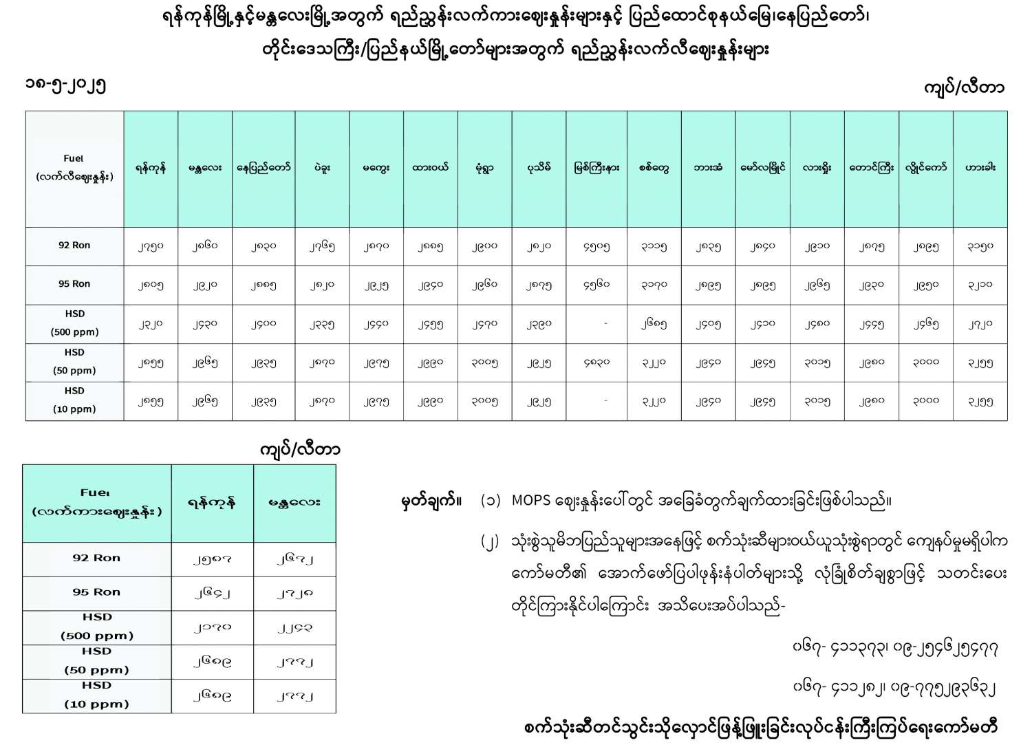 ရန်ကုန်မြို့နှင့် မန္တလေးမြို့အတွက် ရည်ညွှန်းလက်ကားဈေးနှုန်းများနှင့် ပြည်ထောင်စုနယ်မြေ နေပြည်တော်၊ တိုင်းဒေသကြီး/ပြည်နယ် မြို့တော်များအတွက် ရည်ညွှန်းလက်လီဈေးနှုန်းများ 05/18/2025
