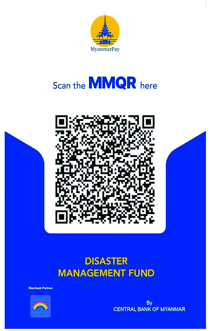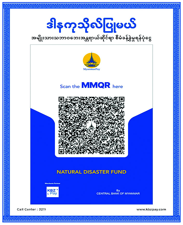 ၂။ အလှူငွေများကို မိုဘိုင်းငွေပေးချေမှုစနစ်ဖြင့် လှူဒါန်းလိုပါက KBZ Pay, CB pay, AYA Pay, OK$, Wave Money တို့၏ QR များကို Scan ဖတ်၍လည်းကောင်း၊ KBZ Pay QR code နံပါတ် 70157401001 သို့လည်းကောင်း၊ Wave Money ဖြင့် လှူဒါန်းလိုပါက ဖုန်းနံပါတ်(၀၉-၂၅၅၀၀၁၅၄၂ နှင့် ၀၉-၂၅၅၀၀၁၅၄၃) တို့သို့ တိုက်ရိုက်ပေးသွင်း၍လည်းကောင်း လှူဒါန်းခြင်းများ ဆောင်ရွက်နိုင်ပါသည်။ ထို့ပြင် ဗဟိုဘဏ်မှခွင့်ပြုထားသော မိမိနှစ်သက်ရာမည်သည့် Digital Wallet သို့မဟုတ် ဘဏ် Mobile Application မှမဆို KBZ Pay MMQR နှင့် CB Pay MMQR၊ OK$ MMQR များကို Scan ဖတ်၍ လှူဒါန်းနိုင်ပါသည်။