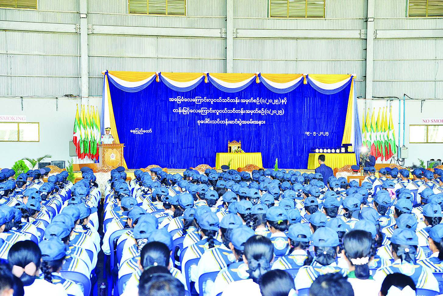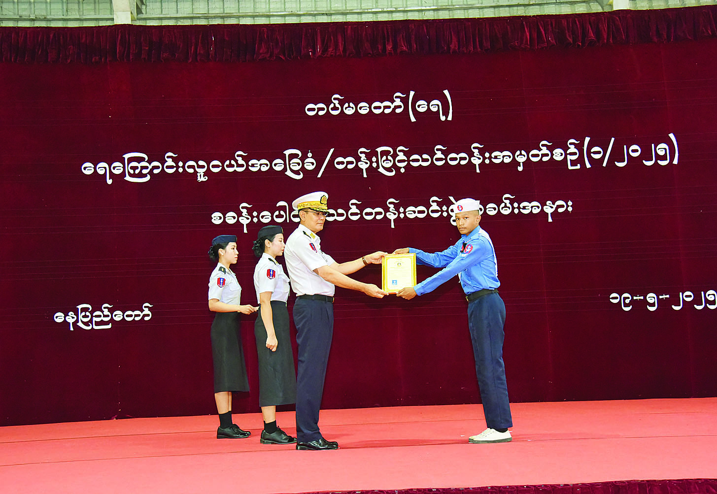 ရေကြောင်းလူငယ်အခြေခံနှင့် တန်းမြင့်သင်တန်း အမှတ်စဉ် (၁/၂၀၂၅) သင်တန်းဆင်းပွဲကို နေပြည်တော်တိုင်းစစ်ဌာနချုပ်၊ ပုဗ္ဗသီရိအားကစားခန်းမ၌ ပြုလုပ်ရာ ကာကွယ်ရေးဦးစီးချုပ် (ရေ) ဗိုလ်ချုပ်ကြီး ထိန်ဝင်း၊ တပ်မတော်အရာရှိကြီးများ၊ နေပြည်တော်ကောင်စီနှင့် ဌာနဆိုင်ရာအသီးသီးမှ ဖိတ်ကြားထားသော ဧည့်သည်တော်များ တက်ရောက်ကြသည်။