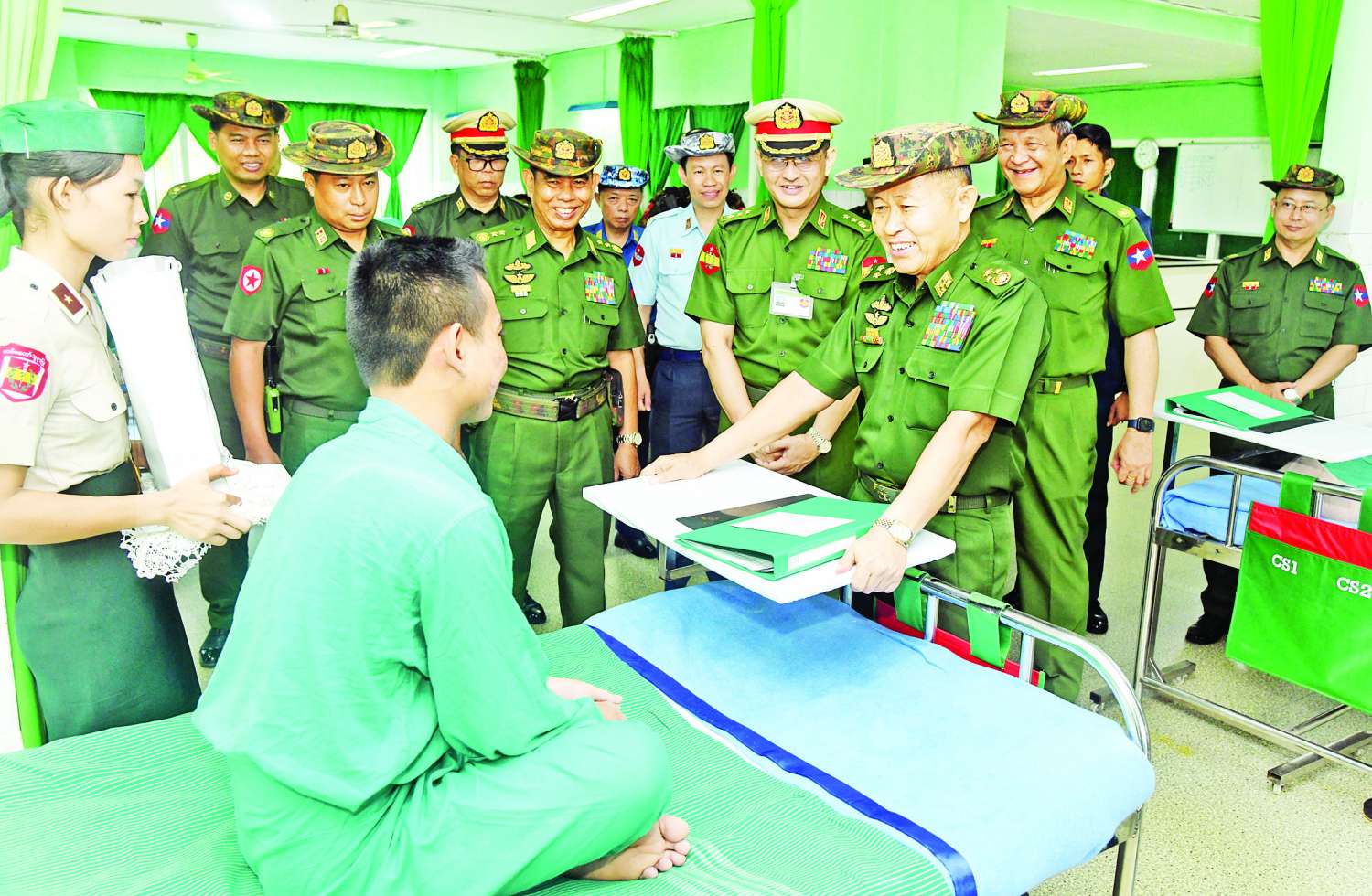 ထို့နောက် နိုင်ငံတော်စီမံအုပ်ချုပ်ရေးကောင်စီဒုတိယဥက္ကဋ္ဌ ဒုတိယတပ်မတော်ကာကွယ်ရေးဦးစီးချုပ် ကာကွယ်ရေးဦးစီးချုပ်(ကြည်း)နှင့် အဖွဲ့ဝင်များသည် ဆေးရုံများတွင် တက်ရောက်ဆေးကုသမှုခံယူလျက်ရှိသည့် အရာရှိ၊ စစ်သည်၊ မိသားစုများအား တစ်ဦးချင်း လိုက်လံကြည့်ရှု၍ ရောဂါဖြစ်ပွားမှုအခြေအနေများ၊ ဆေးဝါးကုသပေးထားမှုအခြေအနေများ၊ ကျန်းမာရေးတိုးတက်ကောင်းမွန်လာမှုအခြေအနေများနှင့်ပတ်သက်၍ တစ်ဦးချင်း ရင်းရင်းနှီးနှီး လိုက်လံမေးမြန်းအားပေးစကားပြောကြားပြီး စားသောက်ဖွယ်ရာများနှင့် ဂုဏ်ပြုချီးမြှင့်ငွေများ ပေးအပ်သည်။