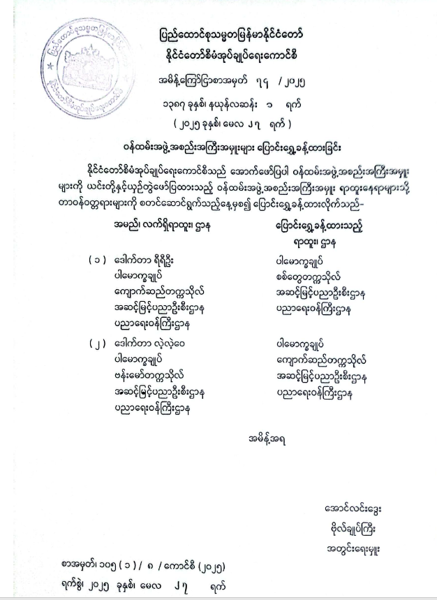 ဝန်ထမ်းအဖွဲ့အစည်းအကြီးအမှူးများ ပြောင်းရွှေ့ခန့်ထားခြင်း