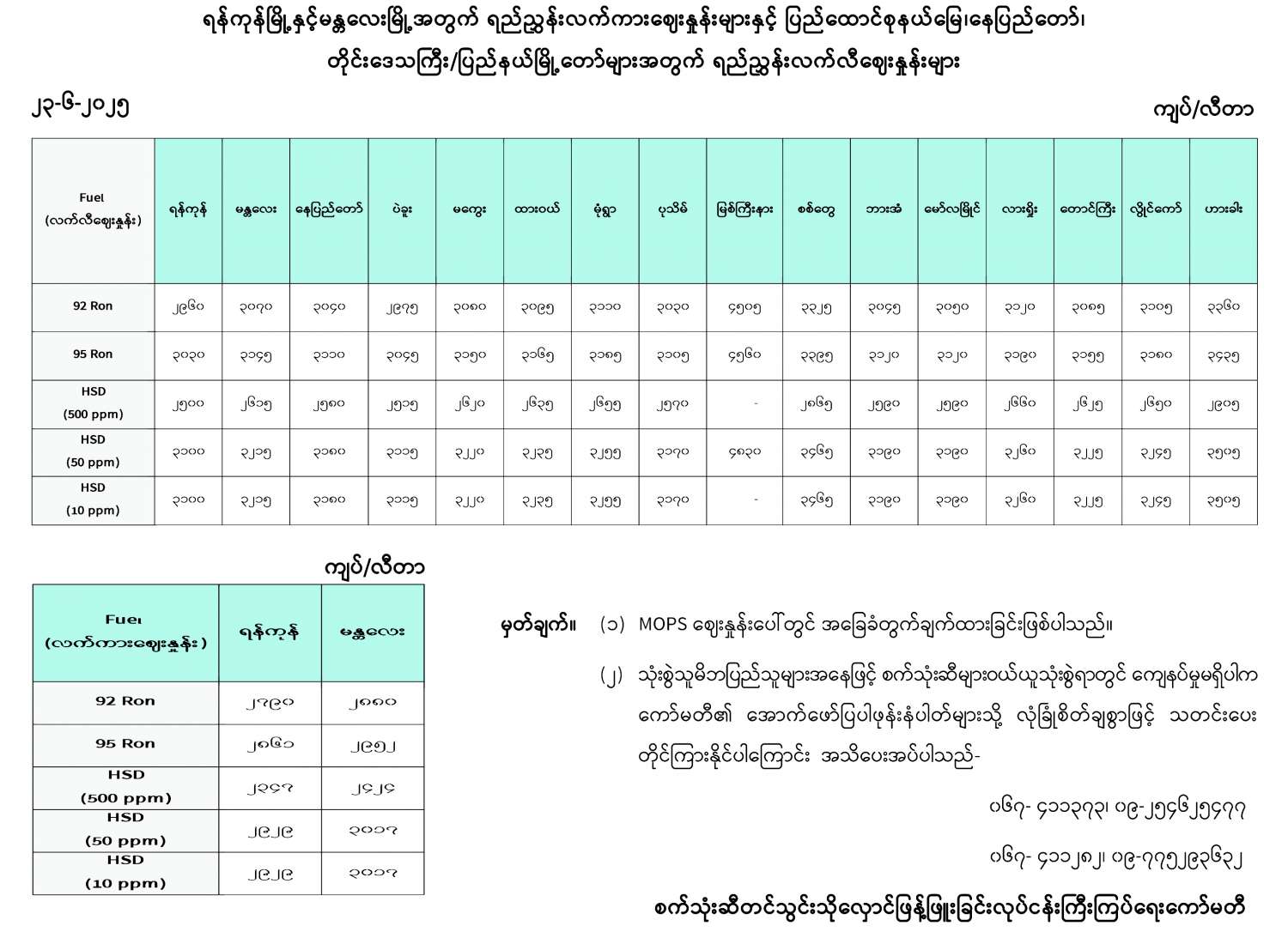 ရန်ကုန်မြို့နှင့် မန္တလေးမြို့အတွက် ရည်ညွှန်းလက်ကားဈေးနှုန်းများနှင့် ပြည်ထောင်စုနယ်မြေ နေပြည်တော်၊ တိုင်းဒေသကြီး/ပြည်နယ် မြို့တော်များအတွက် ရည်ညွှန်းလက်လီဈေးနှုန်းများ 06/23/2025