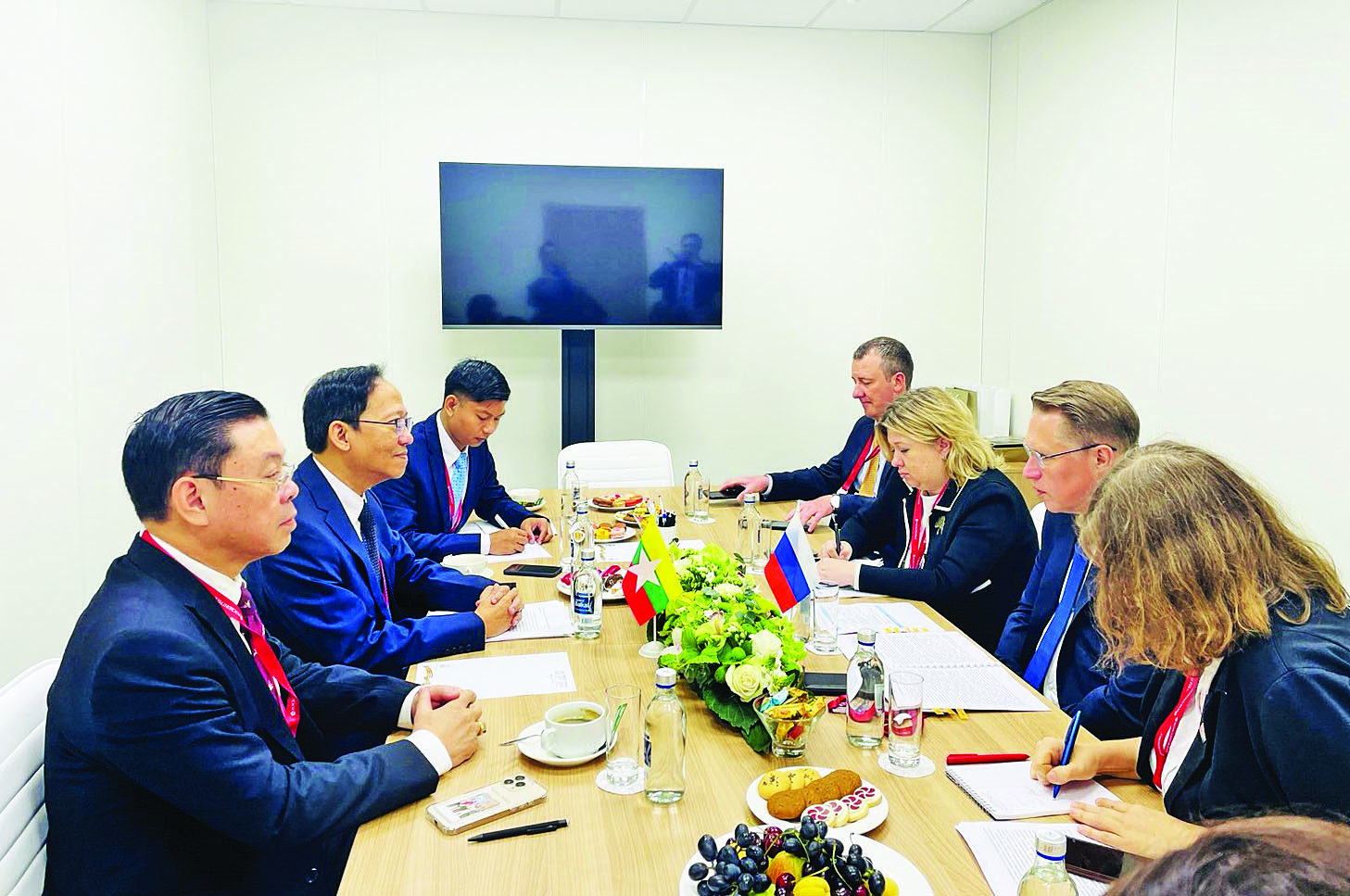 ဇွန် ၁၉ ရက် မနက်ပိုင်းတွင် ပြည်ထောင်စုဝန်ကြီးသည် ရုရှားဖက်ဒရေးရှင်းနိုင်ငံ ကျန်းမာရေးဝန်ကြီး မစ္စတာမီခေးမူရက်စ်ကိုနှင့် ညီလာခံကျင်းပရာ အစည်းအဝေးခန်းမ၌ တွေ့ဆုံပြီး ၂၀၂၅ ခုနှစ် မတ်လက နိုင်ငံတော်အကြီးအကဲခရီးစဉ်၌ နှစ်နိုင်ငံကျန်းမာရေး ဝန်ကြီးဌာနများအကြား လက်မှတ်ရေးထိုးခဲ့သည့် နားလည်မှုစာချွန်လွှာ (MOU) တွင်ပါရှိသည့် ကျန်းမာ ရေးလူ့စွမ်းအားအရင်းအမြစ် ဖွံ့ဖြိုးတိုးတက်ရေးကိစ္စများ၊ နှစ်နိုင်ငံဆေးဘက်ဆိုင်ရာပညာရှင်များ အပြန်အလှန်စေလွှတ်၍ အတွေ့အကြုံဖလှယ်ရေးနှင့် လေ့ကျင့်သင်ကြားပေးရေးကိစ္စရပ်များ၊ တောင်ကြီး စဝ်စံထွန်းဆေးရုံကြီး အဆင့်မြှင့်တင်နိုင်ရေး ပူးပေါင်းဆောင်ရွက်နိုင်မည့်ကိစ္စရပ်များ၊ ရုရှားနိုင်ငံမှ ထုတ်လုပ်သည့်ဆေးဝါးနှင့် ဆေးပစ္စည်းများ၊ ဓာတ်ခွဲခန်းသုံးပစ္စည်းများ တင်သွင်းရောင်းချနိုင်ရေးအတွက် MOU လက်မှတ်ရေးထိုးနိုင်ရေးကိစ္စရပ်များ၊ အဏုမြူရောင်ခြည်ဖြင့် ဆေးကုသမှုလုပ်ငန်းများနှင့် မျိုးရိုးဗီဇကင်ဆာရောဂါ ဆေးကုသမှုလုပ်ငန်းများတွင် နှစ်နိုင်ငံပူးပေါင်းဆောင်ရွက်နိုင်မည့်ကိစ္စရပ်များကို ရင်းနှီးပွင့်လင်းစွာ အမြင်ချင်းဖလှယ် ဆွေးနွေးခဲ့ကြ သည်။