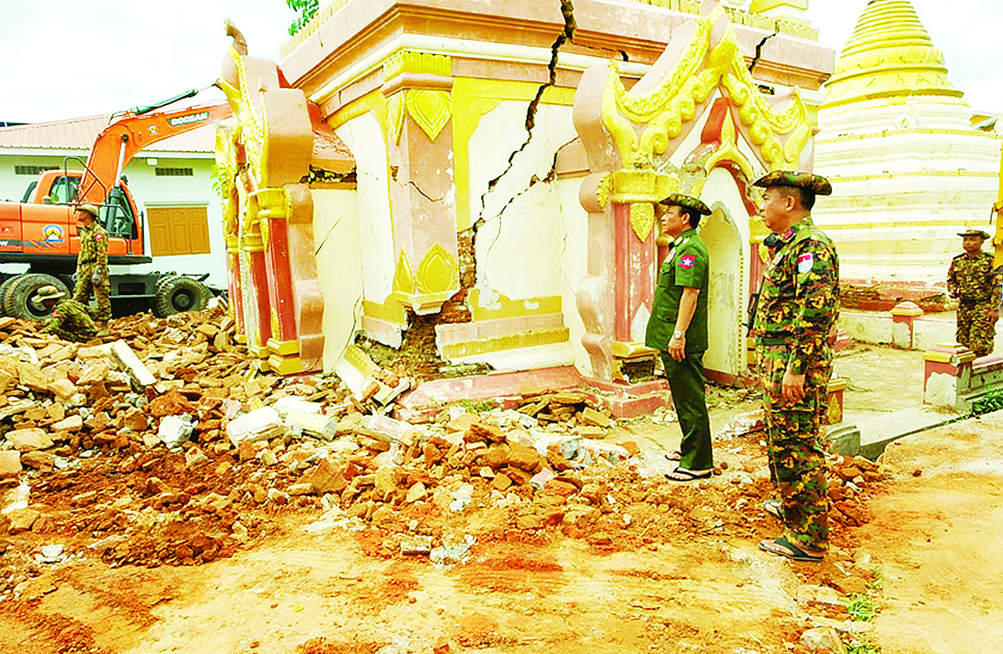 အလားတူ ကာကွယ်ရေးဦးစီးချုပ်ရုံး (ကြည်း) မှ ဒုတိယဗိုလ်ချုပ်ကြီး စိုးတင့်နိုင်နှင့် တာဝန်ရှိသူများသည် မန္တလေးမြို့ချမ်းမြသာစည် မြို့နယ်ကျွန်းလုံးဥသျှောင်ရပ်ကွက် ငါးစို့တိုက်သို့ရောက်ရှိပြီး ငလျင်ဒဏ်ကြောင့် ထိခိုက်ပျက်စီးခဲ့သော ဘုရားစေတီပုထိုးများနှင့် သာသနိကအဆောက်အအုံ အပျက်အစီးများအား တပ်မတော်သားများနှင့် စက်ယန္တရားကြီးများအသုံးပြု၍ အင်တိုက်အားတိုက် ဖယ်ရှားရှင်းလင်းဆောင်ရွက်နေမှု အခြေအနေများကိုလည်းကောင်း၊ ဖယ်ရှားရှင်းလင်းရာတွင် ပြန်လည်တွေ့ရှိသော ရှေးဟောင်း ဌာပနာပစ္စည်းများအားကြည့်ရှု စစ်ဆေးပြီး လုပ်ငန်းများအမြန်ဆုံး ဆောင်ရွက်နိုင်ရေး တာဝန်ရှိသူများအား လိုအပ်သည်များ ပေါင်းစပ်ညှိနှိုင်းဆောင်ရွက်ပေးသည်။