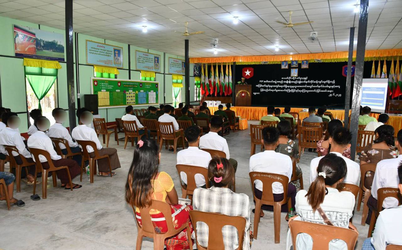 နိုင်ငံတော်အစိုးရအနေဖြင့် PDF အပါအဝင် အဖွဲ့အစည်းအမျိုးမျိုးအမည်ခံ၍ လက်နက်ကိုင်ဆန့်ကျင်လျက်ရှိသည့် အဖွဲ့အစည်းများအတွင်း ရောက်ရှိနေသူများအား ဥပဒေဘောင်အတွင်းသို့ ပြန်လည်ဝင်ရောက်ရန် ဖိတ်ခေါ်လျက်ရှိရာ ပြစ်မှုကျူးလွန်ခြင်းမရှိသော ဒေသအသီးသီးမှ PDF သင်တန်းဆင်း ၁၉ ဦးတို့သည် လက်နက်/ ခဲယမ်းများနှင့်အတူ ဥပဒေဘောင်အတွင်း ပြန်လည်ဝင်ရောက်ခဲ့ကြပြီး ၎င်းတို့အား မိဘအုပ်ထိန်းသူများထံ လွှဲပြောင်းအပ်နှံခြင်းကို ယနေ့နံနက်ပိုင်းတွင် အလယ်ပိုင်းတိုင်းစစ်ဌာနချုပ် နယ်မြေခံသင်တန်းကျောင်း၌ ပြုလုပ်သည်။