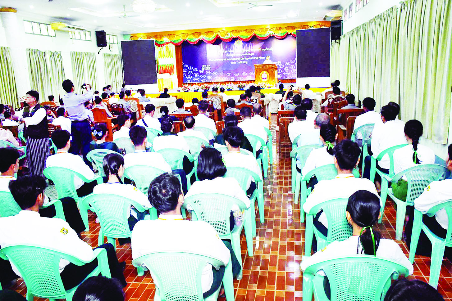 ထို့ပြင် နံနက် ၈ နာရီတွင် ရှမ်းပြည်နယ် တောင်ကြီးမြို့ မြို့တော်ခန်းမ၌ အပြည်ပြည်ဆိုင်ရာ မူးယစ်ဆေးဝါးအလွဲသုံးမှုနှင့် တရားမဝင်ရောင်းဝယ်မှုတိုက်ဖျက်ရေးနေ့ အထိမ်းအမှတ် အခမ်းအနားကို ပြုလုပ်ရာ ရှမ်းပြည်နယ်ဝန်ကြီးချုပ် ဦးအောင်အောင်နှင့် ပြည်နယ်ဝန်ကြီးများ၊ ရှမ်းပြည်နယ်မူးယစ်တားဆီးကာကွယ်ရေးအဖွဲ့ဥက္ကဋ္ဌ၊ လုံခြုံရေးနှင့် နယ်စပ်ရေးရာဝန်ကြီး၊ မြန်မာနိုင်ငံရဲတပ်ဖွဲ့မှ အရာရှိကြီးများနှင့် မူးယစ်ဆေးဝါးတားဆီးနှိမ်နင်းရေးလုပ်ငန်းများကို စွမ်းစွမ်းတမံကြိုးစားဆောင်ရွက်ခဲ့၍ ဆုရရှိသူ ၁၉ ဦး၊ ကျောင်းသား ကျောင်းသူ ၂၀၀ တက်ရောက်ခဲ့ကြပြီး ရှမ်းပြည်နယ်ဝန်ကြီးချုပ်က အဖွင့်အမှာစကားပြောကြား၍ မူးယစ်တားဆီးကာကွယ်ရေးဗဟိုအဖွဲ့ဥက္ကဋ္ဌ၏ သဝဏ်လွှာကို ပြည်နယ်မူးယစ်တားဆီးကာကွယ်ရေးအဖွဲ့ဥက္ကဋ္ဌက ဖတ်ကြားခြင်း၊ ဆုရရှိသူများအား ဆုချီးမြှင့်ခြင်း၊ မူးယစ်ဆေးဝါးအန္တရာယ်တားဆီးကာကွယ်ရေးဆိုင်ရာ အသိပညာပေးပြခန်းများကို လှည့်လည်ကြည့်ရှုခြင်းများ ဆောင်ရွက်ကြသည်။