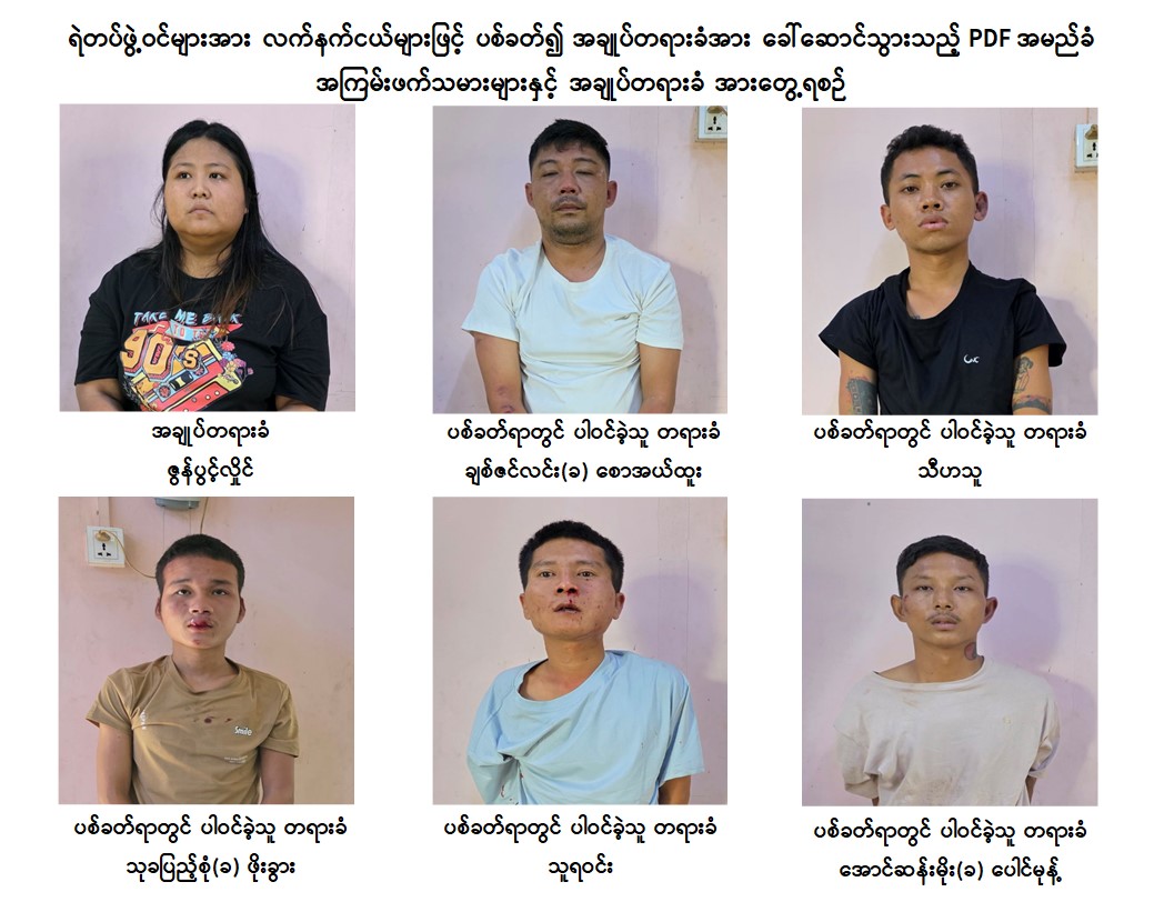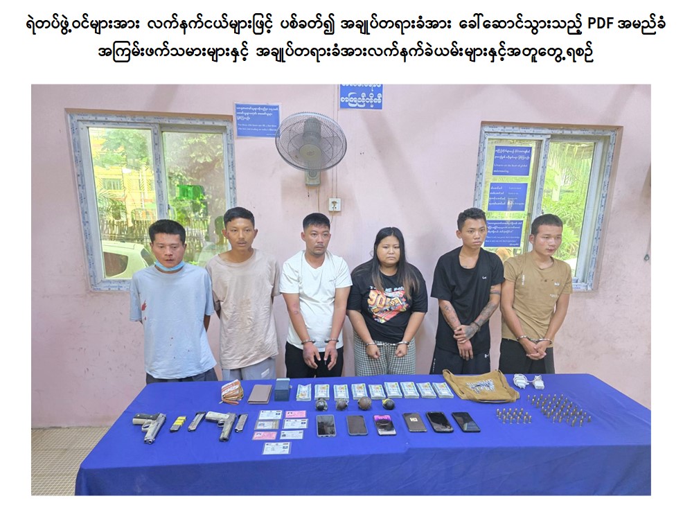 လှိုင်သာယာမြို့မရဲစခန်းမှ ရဲတပ်ဖွဲ့ဝင်များအား လက်နက်ငယ်များဖြင့် ပစ်ခတ်၍ အချုပ်တရားခံအား ခေါ်ဆောင်သွားသည့် PDF အမည်ခံ အကြမ်းဖက်သမားများနှင့် အချုပ်တရားခံအား လက်နက်ခဲယမ်းများနှင့်အတူ ပြန်လည်ဖမ်းဆီးရမိ