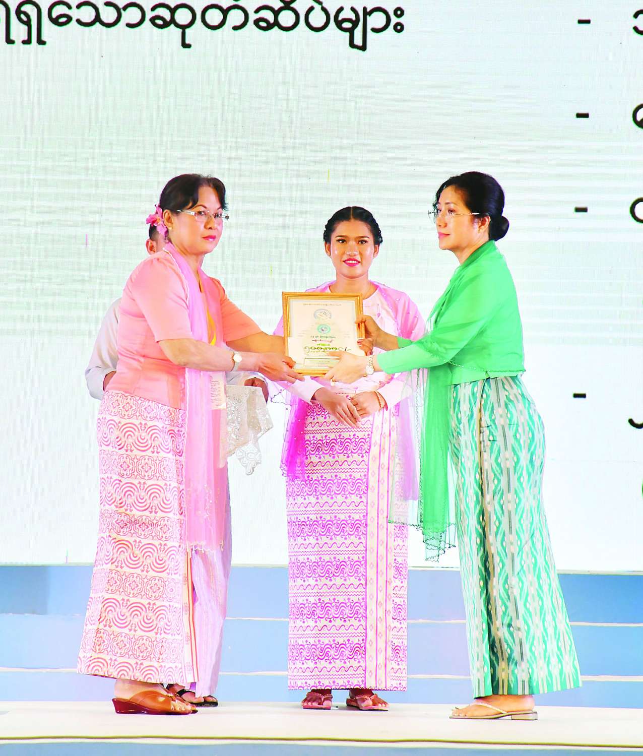 ယင်းနောက် နိုင်ငံတော်စီမံအုပ်ချုပ်ရေးကောင်စီအတွင်းရေးမှူး၏ ဇနီးက ၂၀၂၃ ခုနှစ် အမျိုးသားစာပေဆုရရှိသူ ဒေါ်မြမြသန်း (ကိုယ်စား) ဒေါ်ချိုချိုမော်နှင့် ဒေါ်ခင်ဝတ်ရည်တို့ကိုလည်းကောင်း၊ တွဲဖက်အတွင်းရေးမှူး၏ ဇနီးက ထူးချွန်အမျိုးသမီးဆုရရှိသူ ဒေါက်တာသင်းမျိုးမျိုးအောင်နှင့် အမျိုးသမီးစီးပွားရေးစွမ်းဆောင်ရှင်ဆုရရှိသူ ဒေါ်ကြွေကြွေဇင် တို့ကိုလည်းကောင်း ဂုဏ်ပြုဆုတံဆိပ်၊ ဂုဏ်ပြုမှတ်တမ်းလွှာနှင့် ဂုဏ်ပြုဆုငွေများ ပေးအပ်ချီးမြှင့်ကြသည်။