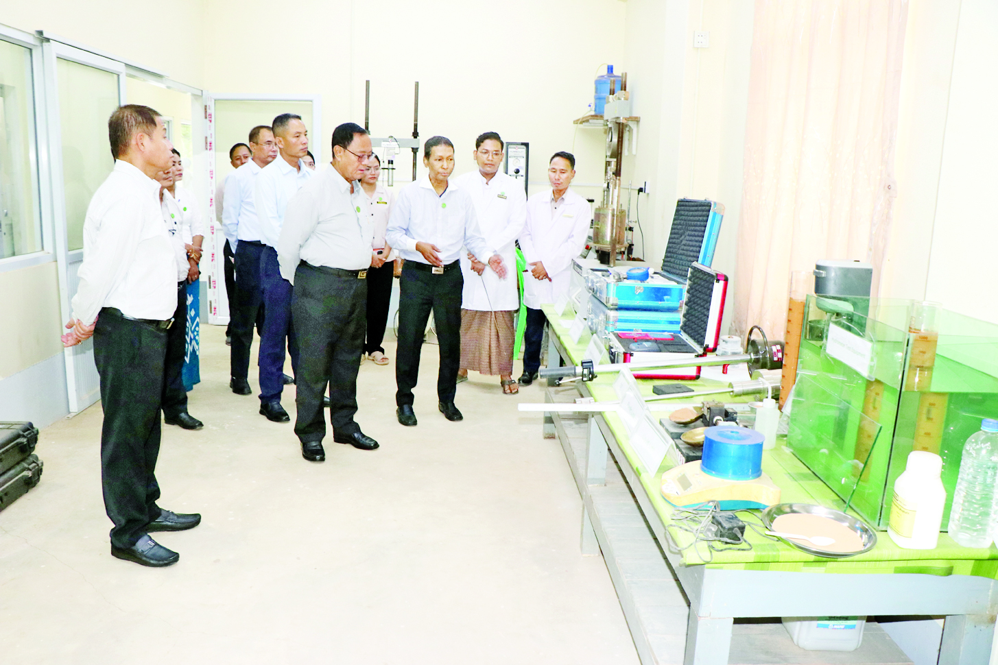 သမဝါယမနှင့် ကျေးလက်ဖွံ့ဖြိုးရေးဝန်ကြီးဌာန ပြည်ထောင်စုဝန်ကြီးဦးလှမိုးသည် အမြဲတမ်းအတွင်းဝန်၊ ညွှန်ကြားရေးမှူးချုပ်များနှင့်အတူ ယနေ့မွန်းလွဲပိုင်းက ရန်ကုန်တိုင်းဒေသကြီး မင်္ဂလာဒုံမြို့နယ် ကျေးလက်လမ်းဖွံ့ဖြိုးရေးဦးစီးဌာန၏ ကျေးလက်လမ်းခင်းပစ္စည်းများ ဓာတ်ခွဲခန်းရုံးသို့သွားရောက်၍ မြေသားလမ်း၊ ကျောက်ချောလမ်း၊ ကတ္တရာလမ်း၊ ကွန်ကရစ်လမ်းများ တည်ဆောက်ရာတွင် အသုံးပြုသော ဒေသအလိုက် မြေအမျိုးမျိုး၏အရည်အသွေးများ စမ်းသပ်ခြင်း၊ ကျောက်၊ သဲ၊ ကတ္တရာ၊ ကွန်ကရစ်အရည်အသွေးများ စမ်းသပ်ခြင်းနှင့် အသုံးပြုလျက်ရှိသည့် အခြေအနေများကို ကြည့်ရှုစစ်ဆေးသည်။