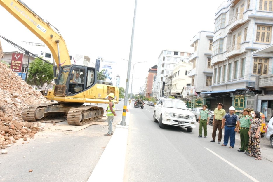 ထို့နောက် ဒုတိယဗိုလ်ချုပ်ကြီး စိုးတင့်နိုင်နှင့်အဖွဲ့သည် အောင်မြေသာစံမြို့နယ်၊ အနှိပ်တော်ရပ်ကွက်ရှိ Sky Villa နေရာသို့သွားရောက်၍ရှင်းလင်းရန်ကျန်ရှိနေသည့်“A”ဆောင်အား စက်ယန္တရားကြီးများအသုံးပြု၍ အပြီးသတ်ဖယ်ရှားရှင်းလင်းရေးလုပ်ငန်းများ ဆောင်ရွက်နေသည့်အခြေအနေများအားလည်းကောင်း၊ ချမ်းအေးသာစံမြို့နယ်၊ စိတ္တရမဟီရပ်ကွက်ရှိ ငလျင်ဒဏ်ကြောင့် ပြိုကျပျက်စီးခဲ့သော အန္တရာယ်ရှိအဆောက်အအုံအပျက်အစီးအား စက်ယန္တရားကြီးများအသုံးပြု၍ အပြီးသတ်ဖယ်ရှားရှင်းလင်းနေမှုများအား ကြည့်ရှုစစ်ဆေးပြီး လုပ်ငန်းခွင်အန္တရာယ်ကင်းရှင်းစေရေး စနစ်တကျပြုလုပ်ဆောင်ရွက်သွားရန်၊ အနီးပတ်ဝန်းကျင်ရှိ အဆောက်အအုံများအား ထိခိုက်မှုမရှိစေရေး အထူးဂရုပြုဆောင်ရွက်ရန်၊ လျှပ်စစ်မီးကြိုးများအား စနစ်တကျ ကြိုတင်ရှင်းလင်းဆောင်ရွက်နိုင်ရေး၊ နေ့စဉ်အများပြည်သူ အသုံးပြုမှုများသည့် လမ်းမကြီးများဖြစ်သည့်အတွက် လမ်းပိတ်ဆို့မှုမဖြစ်စေရေးနှင့် အန္တရာယ်ကင်းစွာသွားလာနိုင်ရေးတို့အား မှာကြားပြီး တာဝန်ရှိသူများ၏ တင်ပြချက်များအပေါ် လိုအပ်သည်များ ပေါင်းစပ်ညှိနှိုင်းဆောင်ရွက်ပေးခဲ့ကြောင်း သတင်းရရှိသည်။