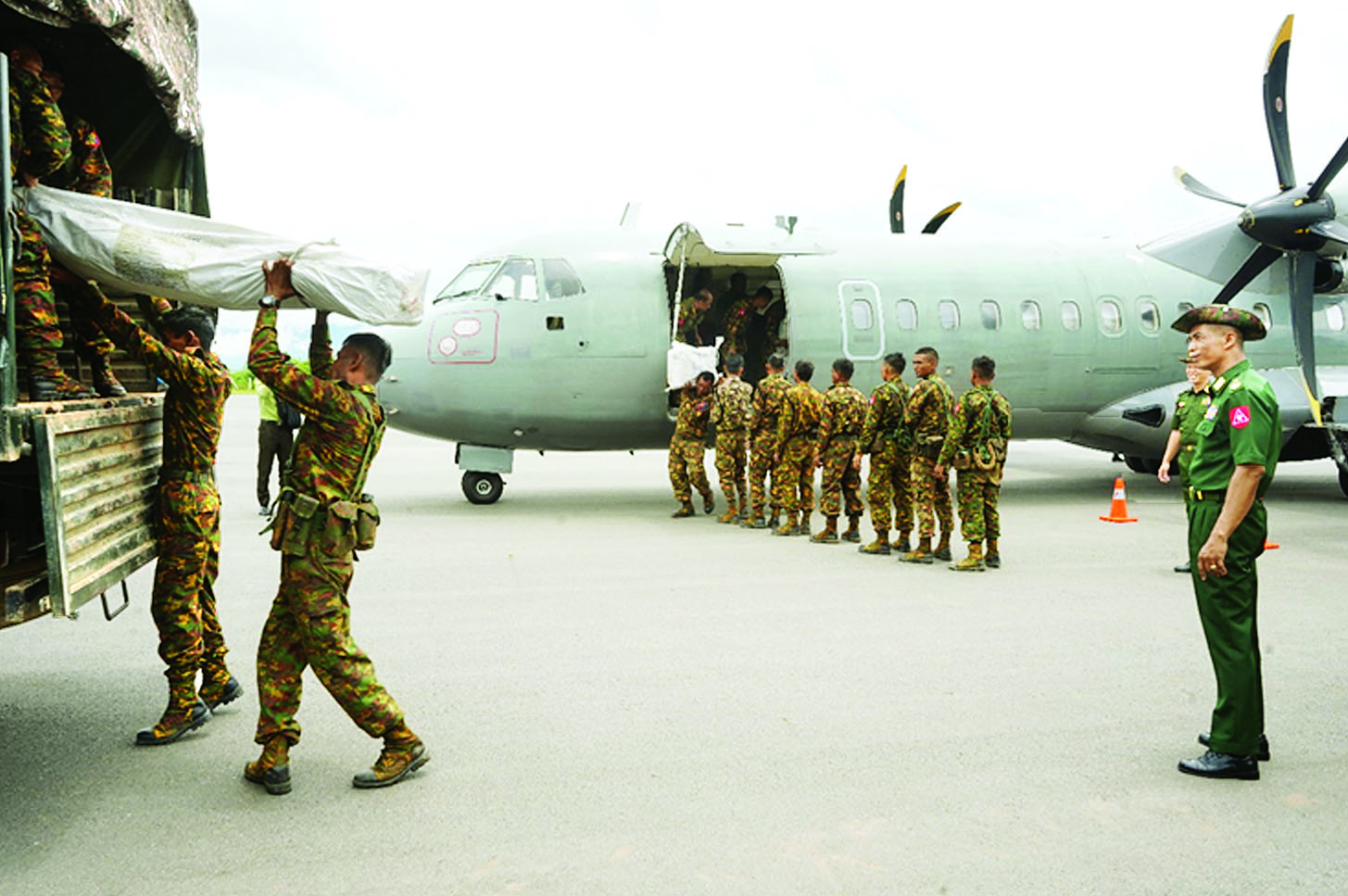 ထို့နောက် ထောက်ပံ့ရေးပစ္စည်းများ သွားရောက်ပို့ဆောင်မည့်ယာဉ်များ၌ ဘေးအန္တရာယ်ဆိုင်ရာစီမံခန့်ခွဲမှုဦးစီးဌာနမှ အိပ်ရာလိပ်နှင့် တစ်ကိုယ်ရေသုံးပစ္စည်းများအပါအဝင် ထောက်ပံ့ရေးပစ္စည်း ၁၆ မျိုး၊ ရှမ်းပြည်နယ်အစိုးရအဖွဲ့မှ ဆန်အိတ် ၁၀၀ အပါအဝင် ထောက်ပံ့ရေးပစ္စည်းလေးမျိုး၊ တြိဂံဒေသတိုင်းစစ်ဌာန ချုပ်မှ ဆန်အိတ် ၁၀၀ အပါအဝင် ထောက်ပံ့ရေးပစ္စည်း နှစ်မျိုး စုစုပေါင်း ၂၂ မျိုးပါဝင်ပြီး ပြည်နယ်အစိုးရအုပ်ချုပ်ရေးအဖွဲ့ခွဲ (ရှမ်းအရှေ့) ဥက္ကဋ္ဌ၊ နယ်မြေခံတပ်မတော်သားများ၊ ခရိုင်ဘေးအန္တရာယ်စီမံခန့်ခွဲမှုဦးစီးဌာနမှ တာဝန်ရှိသူများ၊ ကျိုင်းတုံခရိုင်၊ မိုင်းယန်းခရိုင်မှ ဌာနဆိုင်ရာ တာဝန်ရှိသူများနှင့်အတူ မိုင်းပေါက်မြို့သို့ ဆက်လက်ထွက်ခွာကြသည်။
