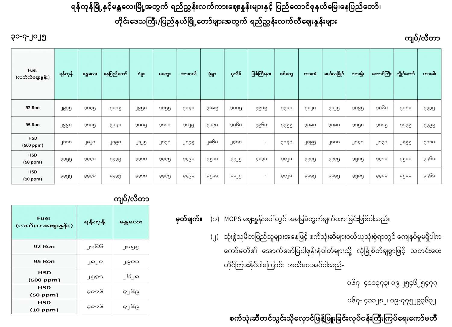 ရန်ကုန်မြို့နှင့် မန္တလေးမြို့အတွက် ရည်ညွှန်းလက်ကားဈေးနှုန်းများနှင့် ပြည်ထောင်စုနယ်မြေ နေပြည်တော်၊ တိုင်းဒေသကြီး/ ပြည်နယ် မြို့တော်များအတွက် ရည်ညွှန်းလက်လီဈေးနှုန်းများ 07/31/2025