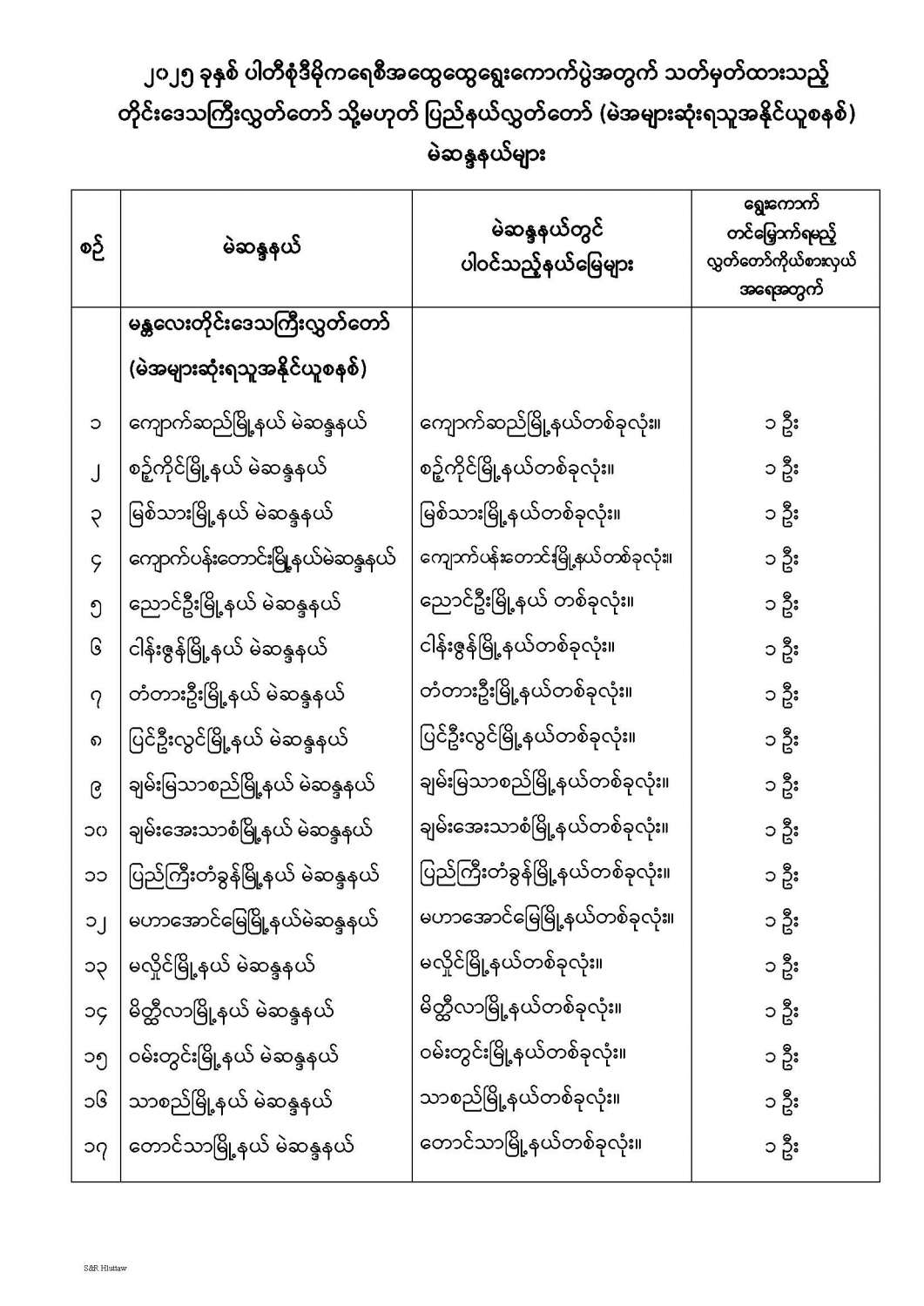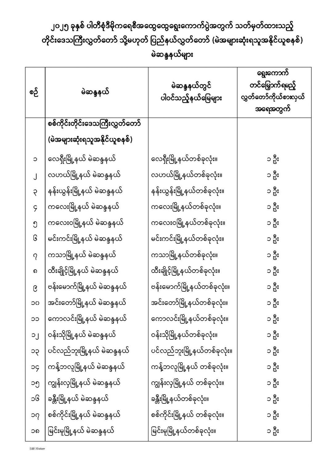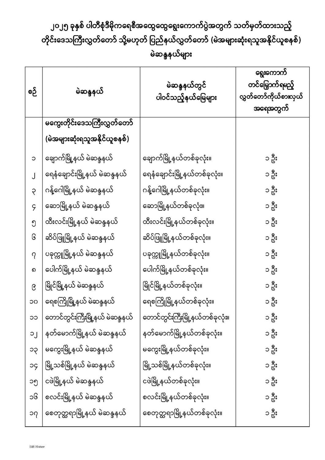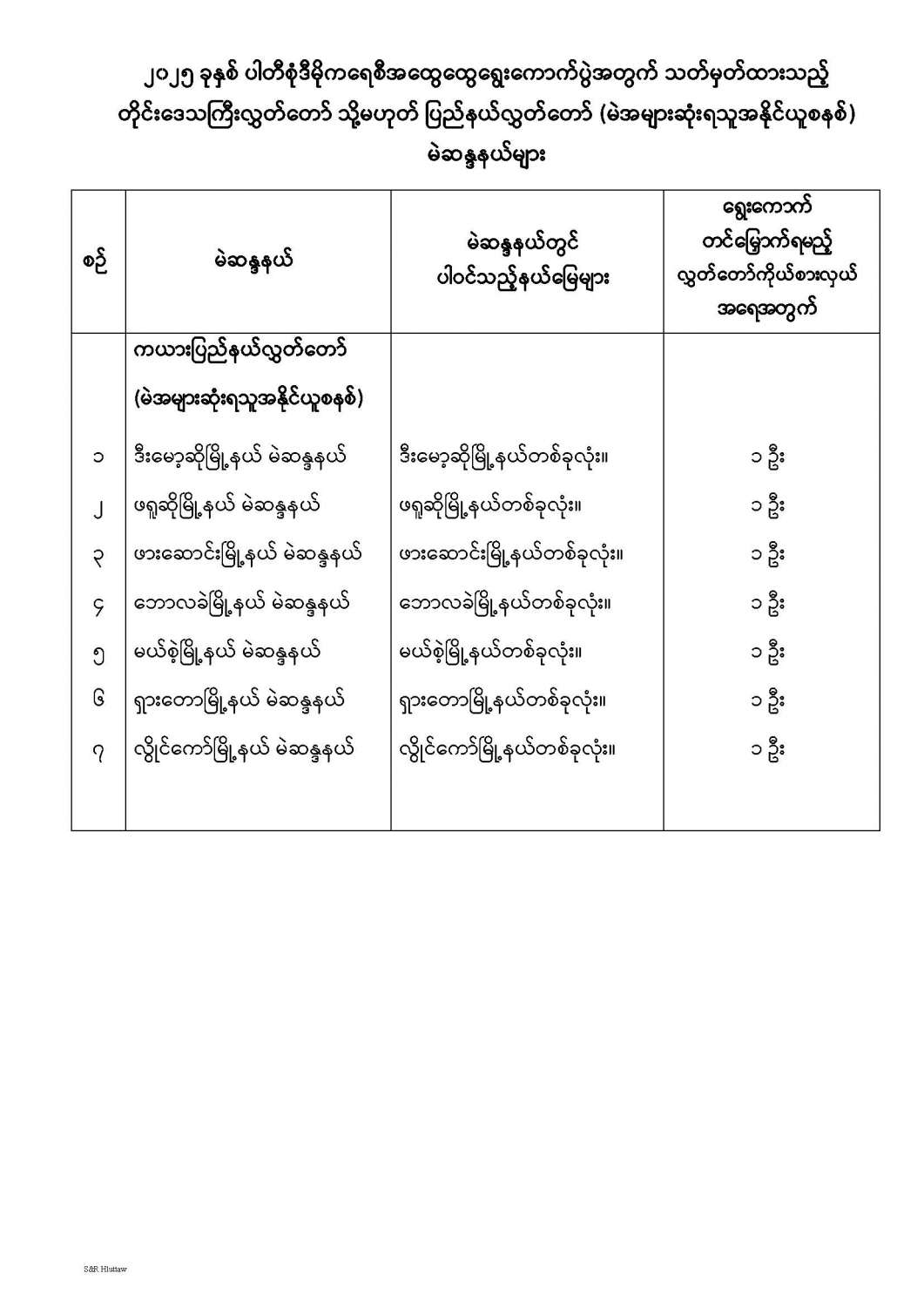တိုင်းဒေသကြီးလွှတ်တော် သို့မဟုတ် ပြည်နယ်လွှတ်တော် မဲဆန္ဒနယ်များ သတ်မှတ်ကြေညာခြင်း