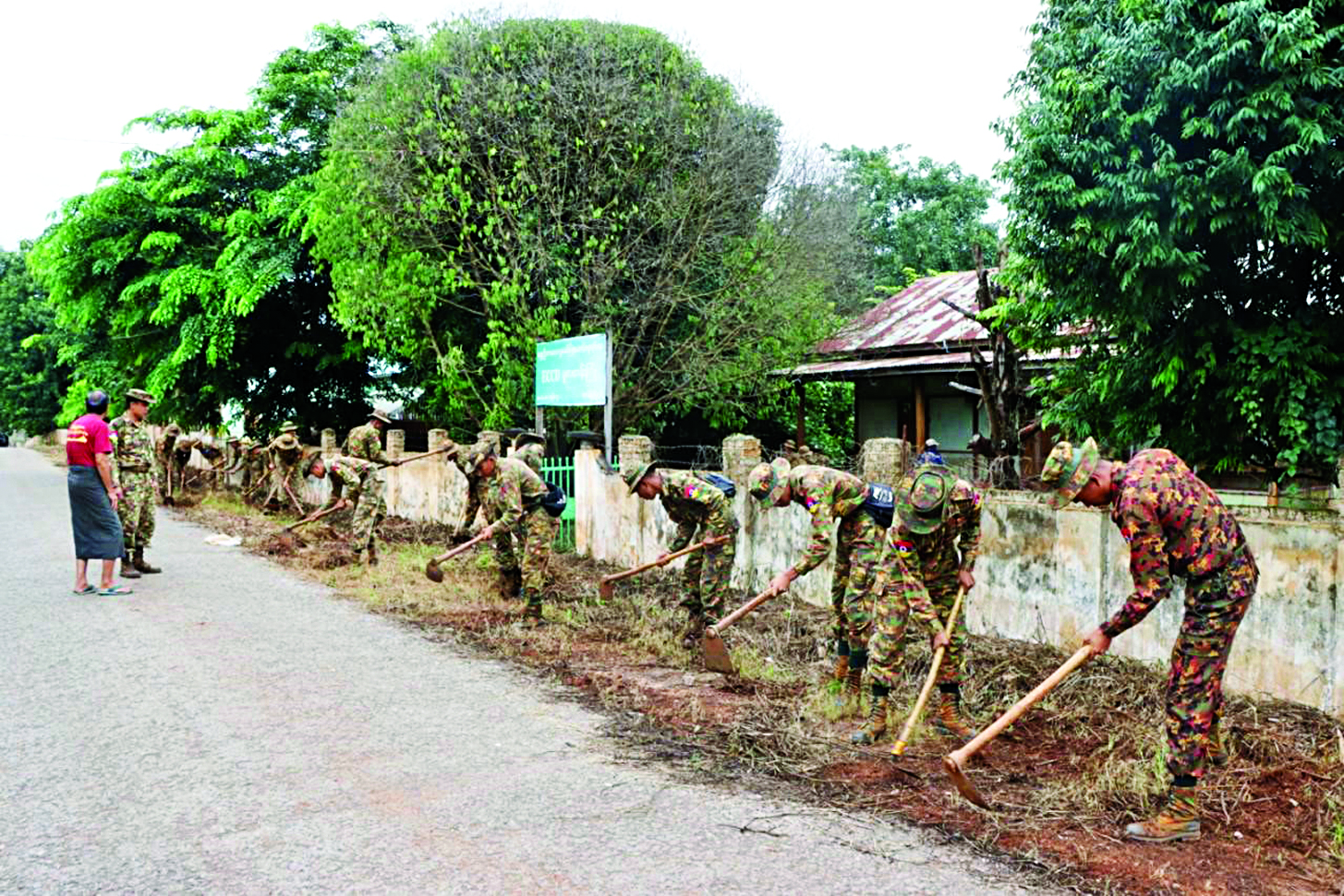 ထိုသို့ ဆောင်ရွက်ပေးလျက်ရှိရာ ယနေ့တွင် ရန်ကုန်တိုင်းဒေသကြီး အလုံမြို့နယ်အပါအဝင် မြို့နယ် ၁၆ မြို့နယ်၊ ရှမ်း ပြည်နယ်(မြောက်ပိုင်း) နောင်ချို မြို့နယ် ဘန့်ဘွေးကျေးရွာရှိ အခြေခံပညာ အထက်တန်းကျောင်း (ဘန့်ဘွေး)၊အခြေခံပညာ မူလတန်းကျောင်း(ဘန့်ဘွေး)နှင့် ရှေးဦးကလေးသူငယ် ပြုစုစောင့်ရှောက်ရေး ECCD မူလတန်းကြိုကျောင်း(ဘန့်ဘွေး)တို့၌ နယ်မြေခံတပ်မတော်သားများ၊ ဌာနဆိုင်ရာဝန်ထမ်းများ၊ လူမှုရေးအသင်းအဖွဲ့များနှင့် ဒေသခံပြည်သူများက အခြေခံပညာကျောင်းများအတွင်း/ အပြင်ရှိ ချုံနွယ်ပေါင်းမြက်များ ခုတ်ထွင်ရှင်းလင်းခြင်း၊ အမှိုက်များရှင်းလင်းခြင်း၊ ရေစီးရေလာကောင်းမွန်စေရေး ရေနုတ်မြောင်းများတူးဖော်ပေးခြင်း၊ ရေကန်များတွင် အဘိတ်ဆေးခတ်ပေးခြင်း၊ ခြင်ခိုအောင်းနိုင်သည့်နေရာများအား ခြင်ဆေးဖျန်းခြင်းနှင့် ကျန်းမာရေး အသိပညာပေးလက်ကမ်းစာစောင်များ ဖြန့်ဝေပေးခြင်းများ စုပေါင်းဆောင်ရွက်ကြသည်။