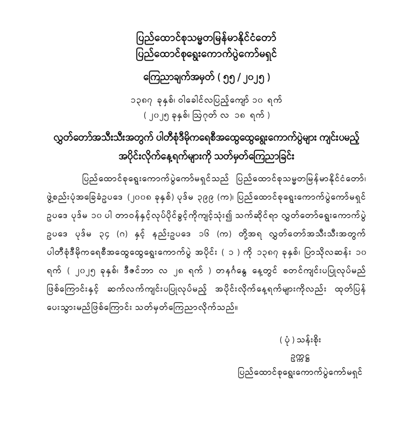 လွှတ်တော်အသီးသီးအတွက် ပါတီစုံဒီမိုကရေစီအထွေထွေရွေးကောက်ပွဲများ ကျင်းပမည့် အပိုင်းလိုက်နေ့ရက်များကို သတ်မှတ်ကြေညာခြင်း