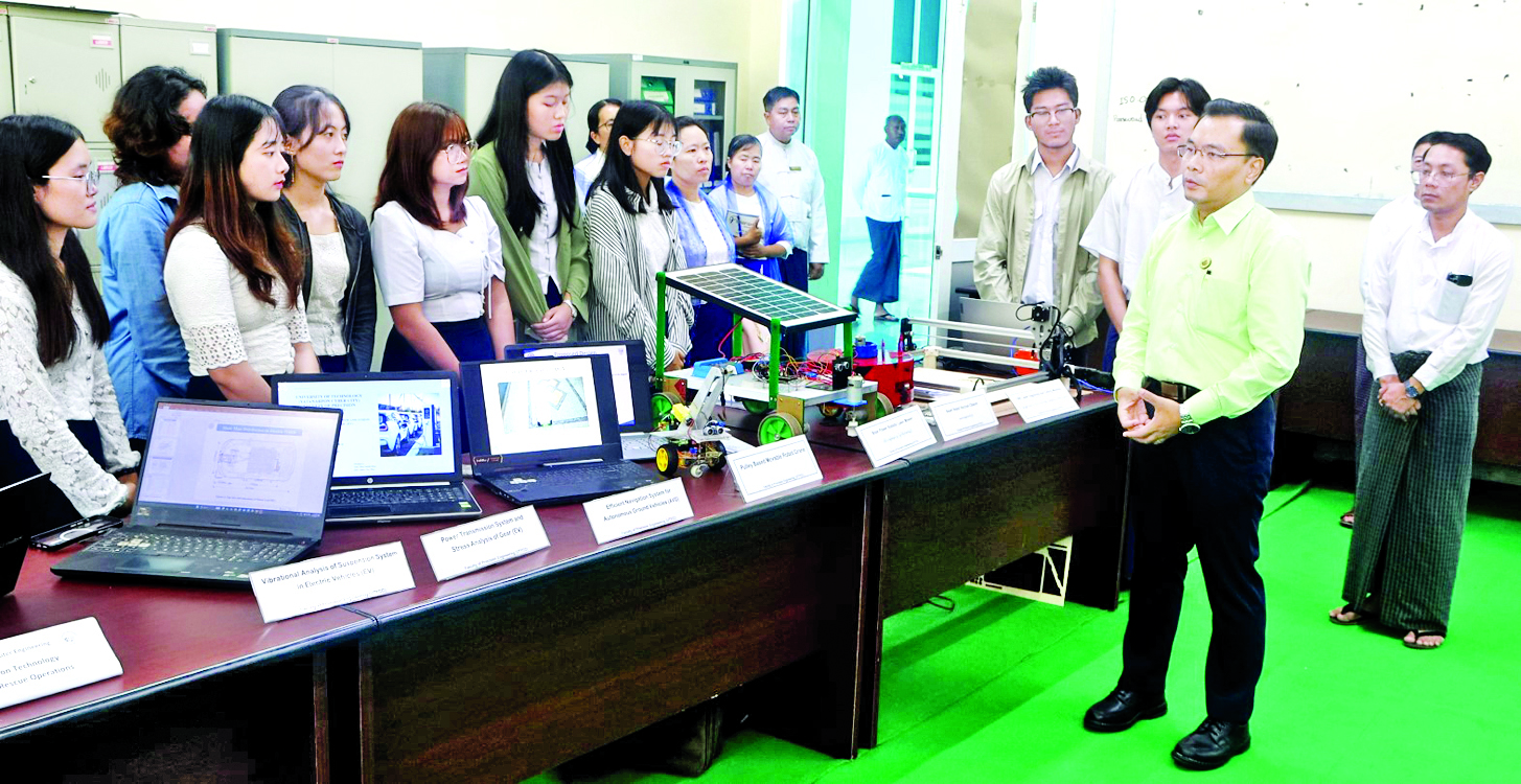 သိပ္ပံနှင့်နည်းပညာဝန်ကြီးဌာန ဒုတိယဝန်ကြီး ဒေါက်တာအောင်ဇေယျသည် သြဂုတ် ၁၅ ရက် နံနက်ပိုင်းက ပြင်ဦးလွင်မြို့ရှိ နည်းပညာတက္ကသိုလ် (ရတနာပုံဆိုက်ဘာစီးတီး) ပင်မစာသင်ဆောင်၌ ခင်းကျင်းပြသထားသည့် မဟာဌာနကျောင်းသား ကျောင်းသူများ၏ သုတေသနပရောဂျက်ပြပွဲတွင် ဆိုလာနည်းပညာ၊ စက်ရုပ်နည်းပညာ၊ စွန့်ပစ်ပစ္စည်း မှထုတ်ကုန်များ ပြန်လည်ထုတ်ယူသည့်နည်းပညာ၊ ဆက်စပ်ဌာနများနှင့် ပူးပေါင်းဆောင်ရွက်နေသည့် AI သုံး ကျန်းမာရေးနှင့် မွေးမြူရေးဆိုင်ရာ သုတေသနပရောဂျက်များမှရလဒ်များကို ကြည့်ရှုစစ်ဆေးသည်။