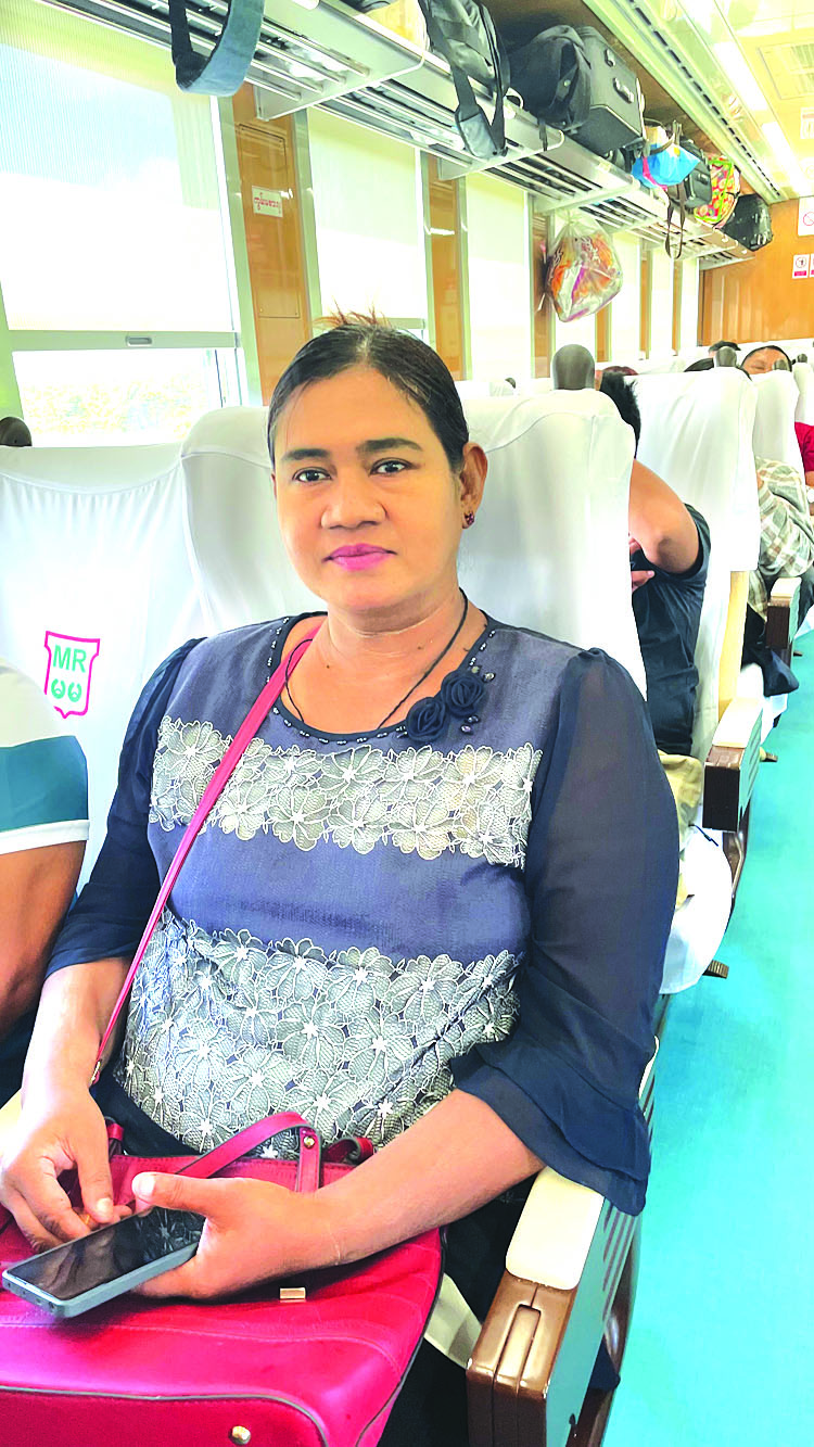 ကျွန်မကတော့ ပျဉ်းမနားမြို့မှာ နေထိုင်တာဖြစ်ပါတယ်။ အခုနေပြည်တော်ကနေ ရန်ကုန်ကို အလုပ်ကိစ္စနဲ့ သွားရောက်တာဖြစ်ပါတယ်။ အရင်ကတော့ ရန်ကုန်မြို့ကိုပဲဖြစ်ဖြစ်၊ မန္တလေးမြို့ကိုပဲဖြစ်ဖြစ် သွားရင်လေအိတ်ကားတွေနဲ့ပဲ သွားလာခဲ့ကြတာပေါ့။ အခုကျတော့ ခေတ်မီလှတဲ့ ရထားကြီးနဲ့ အဆင့်မီမီသွားလာလို့ရတဲ့အတွက် အလွန်ကို ကျေနပ်မိပါတယ်။ ဒီလိုအေးအေးဆေးဆေးသွားလာနိုင်ခဲ့လိမ့် မယ်လို့မထင်မှတ်ထားပါဘူး။ ဒီလို ရထားမျိုးကို နိုင်ငံခြားရုပ်ရှင်တွေ၊ ရုပ်မြင်သံကြားတွေထဲကပဲ မြင်ခဲ့ကြည့်ခဲ့ရတာပါ။ အခုကိုယ့်နိုင်ငံမှာ ကိုယ်တိုင်ကိုယ်ကျ စီးခွင့်ရတဲ့အတွက်လည်း ဂုဏ်ယူမိတယ်။ နောက်ပြီး ရထားက မြန်လည်းမြန်တယ်။ ရထားအတွင်းပိုင်းတွေကလည်း အလွန်ကို သန့်ရှင်းသပ်ရပ်မှုရှိတယ်။ အဲကွန်းလည်းပါတဲ့အတွက် အေးအေးဆေးဆေး စီးရတာပေါ့။