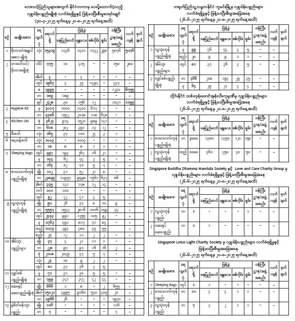 နိုင်ငံတကာအလှူရှင်များက ၂၆-၆-၂၀၂၅ ရက်နေ့မှ ၂၀-၈-၂၀၂၅ ရက်နေ့အတွင်း လှူဒါန်းခဲ့သည့်ပစ္စည်းများကို ဘေးသင့်ပြည်သူများအတွက် ဖြန့်ခွဲပေးပို့ဆောင်ရွက်ခဲ့မှုကို ပူးတွဲပါဇယားများဖြင့် ဖော်ပြအပ်ပါသည်။ ပြည်တွင်း/ ပြည်ပမှ ပစ္စည်းများ ထပ်မံလှူဒါန်းသည့် အချိန်တွင် ပစ္စည်းများရောက်ရှိမှုနှင့် ငလျင်ဘေးသင့်ပြည်သူများထံ အမြန်ဆုံးရောက်ရှိ ဖြန့်ခွဲမှုတို့ကို အလျဉ်းသင့်သလို ဆက်လက်ထုတ်ပြန်သွားမည်ဖြစ်ပါကြောင်း သတင်းထုတ်ပြန်အပ်ပါသည်။