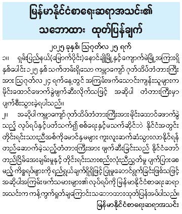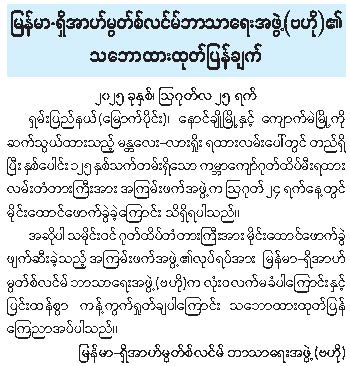 ထို့ပြင် ဗုဒ္ဓဘာသာကလျာဏယုဝအသင်း YMBA (ဗဟို)၊ ဘာသာပေါင်းစုံ ချစ်ကြည်ညီညွတ်ရေးအဖွဲ့ (ဗဟို)၊ မြန်မာနိုင်ငံဧဝံဂေလိခရစ်ယာန်မဟာမိတ်အဖွဲ့ချုပ်၊ ပြည်ထောင်စု မြန်မာနိုင်ငံမက်သဒစ်အသင်းတော် (အောက်မြန်မာပြည်)၊ ယုံကြည်ခြင်း ဧဝံဂေလိအသင်းတော် (ပဲခူး)၊ လွတ်မြောက်ခြင်းအသင်းတော် (ရန်ကုန်)၊ မြန်မာနိုင်ငံလုံးဆိုင်ရာဟိန္ဒူ ဘာသာရေးဗဟိုအဖွဲ့ချုပ်၊ မြန်မာနိုင်ငံလုံးဆိုင်ရာ တမီလ်ဟိန္ဒူဖောင်ဒေးရှင်း (ဗဟို)၊ သနန္တဓမ္မပါလက (ဟိန္ဒူ) အဖွဲ့ချုပ်၊ မြန်မာနိုင်ငံလုံးဆိုင်ရာ အစ္စလာမ်ဘာသာရေးအဖွဲ့ကြီး၊ ပိန္နဲကုန်းရခိုင်ဂျာမေဗလီ၊ ဘူးသီးတောင်မောင်တောဒေသဖွံ့ဖြိုးရေးအသင်း၊ မြန်မာနိုင်ငံပန်းချီပန်းပု အစည်းအရုံး (ဗဟို)၊ မြန်မာနိုင်ငံသဘင်အစည်းအရုံး (ဗဟို)၊ မြန်မာနိုင်ငံဟာသပညာရှင်များ အစည်းအရုံး၊ မြန်မာ-ရှိအာဟ် မွတ်စ်လင်စ်ဘာသာရေးအဖွဲ့ (ဗဟို)၊ မြန်မာနိုင်ငံသတင်းမီဒီယာကောင်စီ၊ မြန်မာနိုင်ငံအားကစားမီဒီယာများ အဖွဲ့ချုပ်၊ မြန်မာနိုင်ငံရုပ်ရှင်အစည်းအရုံး၊ မြန်မာနိုင်ငံစာရေးဆရာအသင်းနှင့် မြန်မာနိုင်ငံဂီတအစည်းအရုံး (ဗဟို) တို့မှ ပြင်းထန်စွာ ကန့်ကွက်ရှုတ်ချပါကြောင်း သဘောထားများ အသီးသီးထုတ်ပြန်ခဲ့ကြကြောင်း သတင်းရရှိသည်။