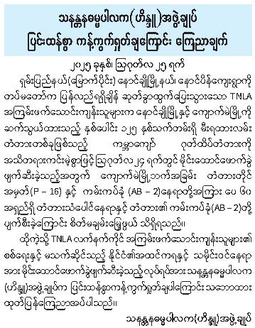 မြန်မာနိုင်ငံ၏ အထင်ကရအမှတ်အသားတစ်ခုဖြစ်ပြီး ကမ္ဘာ့အံ့ဖွယ်စာရင်းတွင်လည်း ပါဝင်ခဲ့သည့် နှစ်ပေါင်း ၁၂၅ နှစ်သက်တမ်းရှိ ကမ္ဘာကျော်ဂုတ်ထိပ်မီးရထားလမ်းတံတားအား ထိန်းသိမ်းစောင့်ရှောက်ရမည့်အစား TNLA အကြမ်းဖက်သောင်းကျန်းသူများက စစ်ရေးနှင့် သက်ဆိုင်ခြင်းမရှိဘဲ ဆင်ခြင်တုံတရားကင်းမဲ့စွာ မိုင်းထောင်ဖောက်ခွဲဖျက်ဆီးခဲ့မှုအပေါ် ပြည်သူလူထုတစ်ရပ်လုံးက လုံးဝလက်ခံနိုင်ခြင်းမရှိဘဲ ကန့်ကွက်ရှုတ်ချလျက်ရှိသည်။