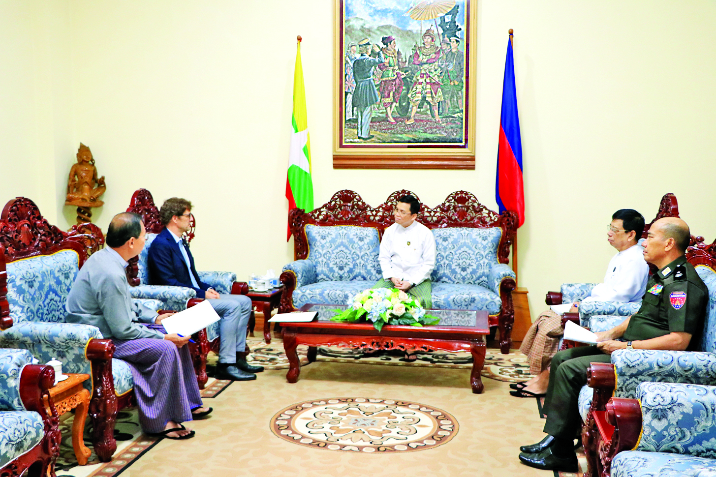 တွေ့ဆုံစဉ် အပြည်ပြည်ဆိုင်ရာ ကြက်ခြေနီကော်မတီ(ICRC) အဖွဲ့ဝင်များ၏ ပြည်ဝင်ဗီဇာနှင့် နေခွင့်ဆိုင်ရာကိစ္စရပ်များကို ဥပဒေနှင့်အညီ စိစစ်ခွင့်ပြုဆောင်ရွက်ပေးနေမှု၊ ICRC က မြန်မာနိုင်ငံ အတွင်း ငလျင်နှင့် သဘာဝဘေး အန္တရာယ်ဖြစ်ပွားခဲ့သည့် နေရာဒေသများသို့သွားရောက်၍ လူသားချင်းစာနာထောက်ထားမှုဆိုင်ရာ ပံ့ပိုးကူညီမှုများ ဆောင်ရွက်ပေးမှု၊ ကျန်းမာရေးဆိုင်ရာနှင့် ပြန်လည် ထူထောင်ရေးဆိုင်ရာကိစ္စရပ်များနှင့်ပတ်သက်၍ သက်ဆိုင်ရာဒေသအာဏာပိုင် အဖွဲ့အစည်းများနှင့် လက်တွဲပူးပေါင်းဆောင်ရွက်နေမှုနှင့် ဆက်လက် ကူညီဆောင်ရွက်သွားမည့် အစီအစဉ်များနှင့် စပ်လျဉ်း၍ ရင်းနှီးပွင့်လင်းစွာ အမြင်ချင်းဖလှယ်ဆွေးနွေးကြသည်။