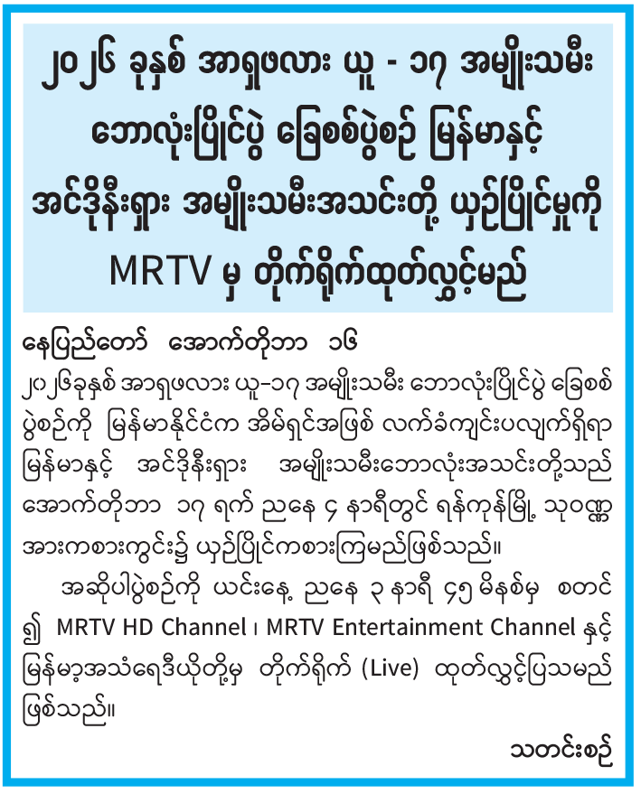 ၂၀၂၆ ခုနှစ် အာရှဖလား ယူ - ၁၇ အမျိုးသမီး ဘောလုံးပြိုင်ပွဲ ခြေစစ်ပွဲစဉ် မြန်မာနှင့်အင်ဒိုနီးရှားအမျိုးသမီးအသင်းတို့ယှဉ်ပြိုင်မှုကို MRTV မှ တိုက်ရိုက်ထုတ်လွှင့်မည် 10/17/2025