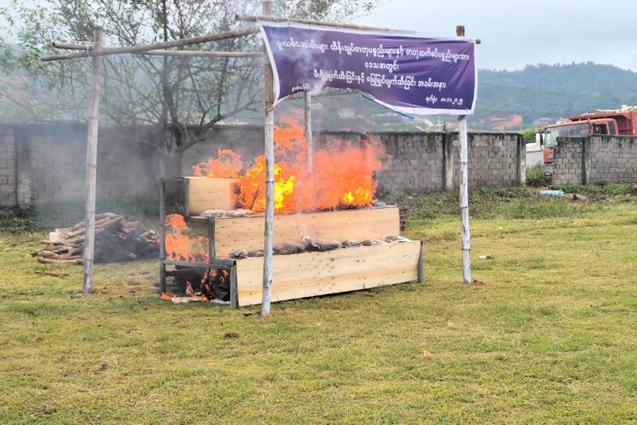 ထိုသို့ဆောင်ရွက်လျက်ရှိရာ ရှမ်းပြည်နယ်(မြောက်ပိုင်း)၊ မူဆယ်မြို့နယ်အတွင်း ဖမ်းဆီးရမိသည့် မူးယစ်ဆေးဝါးများ၊ ထိန်းချုပ်ဓာတုပစ္စည်းများနှင့် ဓာတုဆက်စပ်ပစ္စည်းများအား ရှမ်းပြည်နယ်ရဲတပ်ဖွဲ့မှူးရုံး၏ ညွှန်ကြားချက်အရ ဒေသတွင်းမီးရှို့ဖျက်ဆီးခြင်းနှင့် မြေမြှုပ်ဖျက်ဆီးခြင်း အခမ်းအနားကို နိုဝင်ဘာ ၈ ရက် နံနက်ပိုင်းတွင် မူဆယ်မြို့၊ စွမ်စော်ရပ်ကွက်၌ ကျင်းပပြုလုပ်ရာ နယ်မြေခံလုံခြုံရေးတပ်ဖွဲ့များနှင့် ဌာနဆိုင်ရာများမှ တာဝန်ရှိသူများ၊ ခရိုင်၊ မြို့နယ်အဆင့် ဌာနဆိုင်ရာဝန်ထမ်းများနှင့် ဖိတ်ကြားထားသူများ တက်ရောက်ကြသည်။