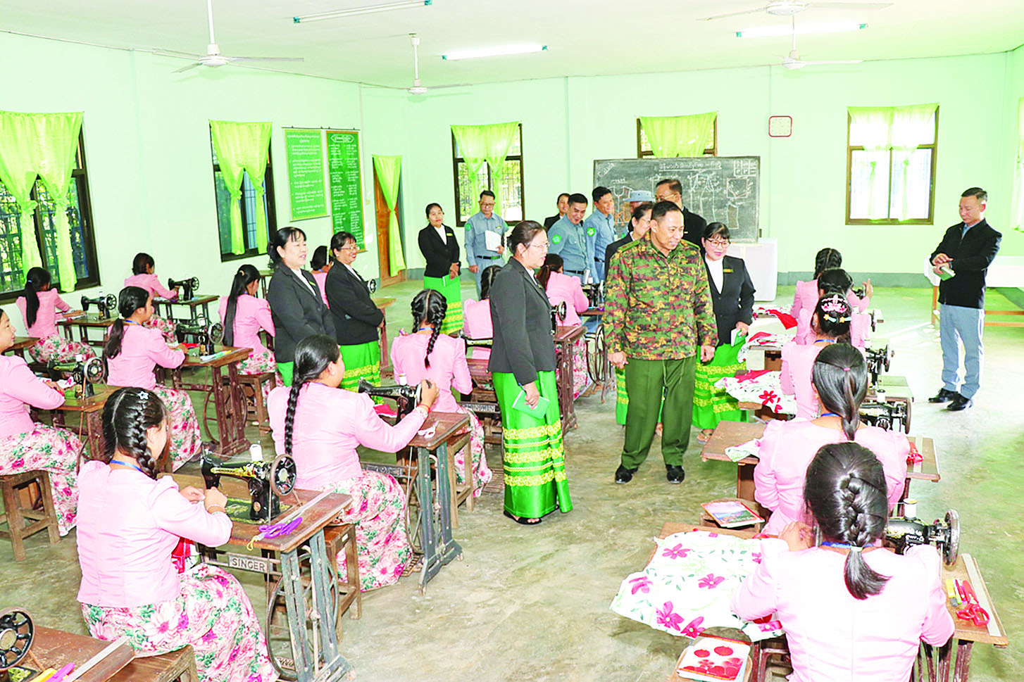 ထို့နောက် ပြည်ထောင်စု ဝန်ကြီးနှင့်အဖွဲ့သည် မိုင်းဖြတ်မြို့မှ တာချီလိတ်မြို့ရှိ အမျိုးသမီး အိမ်တွင်းမှု သက်မွေးလုပ်ငန်း ပညာသင်တန်းကျောင်းသို့ ရောက်ရှိပြီး ဝန်ထမ်းများ၊ နည်းပြများ၊ သင်တန်းသူများနှင့် တွေ့ဆုံ၍ သင်တန်းသူများအနေဖြင့် သင်ကြားပေးသည့် ဘာသာရပ်များကို ကျွမ်းကျင်ပိုင်နိုင်အောင် ကြိုးစားအားထုတ် လေ့ကျင့်သင်ကြားကာ ကိုယ်ပိုင်စီးပွားရေးလုပ်ငန်းများ ဆောင်ရွက်နိုင်သည်အထိ ကြိုးပမ်းဆောင်ရွက်သွားကြရန်မှာကြားပြီး ချီးမြှင့်ငွေများ ပေးအပ်ပြီး ကျောင်းဝင်းအတွင်း လိုက်လံကြည့်ရှုစစ်ဆေးသည်။