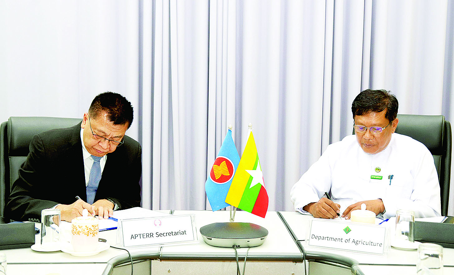 အဆိုပါ သဘောတူညီမှုစာချွန်လွှာများကို နေပြည်တော်ရှိ ရုံးအမှတ်(၁၅) ၌ စိုက်ပျိုးရေးဦးစီးဌာန ညွှန်ကြားရေးမှူးချုပ် ဒေါက်တာရဲတင့်ထွန်းနှင့် APTERR အတွင်းရေးမှူးချုပ်ရုံးမှ အထွေထွေမန်နေဂျာ Dr. Choomjet Karn-janakesorn တို့က လက်မှတ်ရေးထိုးခဲ့ခြင်းဖြစ်ပြီး လက်မှတ်ရေးထိုးပွဲသို့ စိုက်ပျိုးရေး၊ မွေးမြူရေးနှင့်ဆည်မြောင်းဝန်ကြီးဌာန စီမံကိန်းဦးစီးဌာန၊ စိုက်ပျိုးရေးဦးစီးဌာနနှင့် APTERR အတွင်း ရေးမှူးချုပ်ရုံးမှ တာဝန်ရှိသူများလည်း တက်ရောက်ကြသည်။